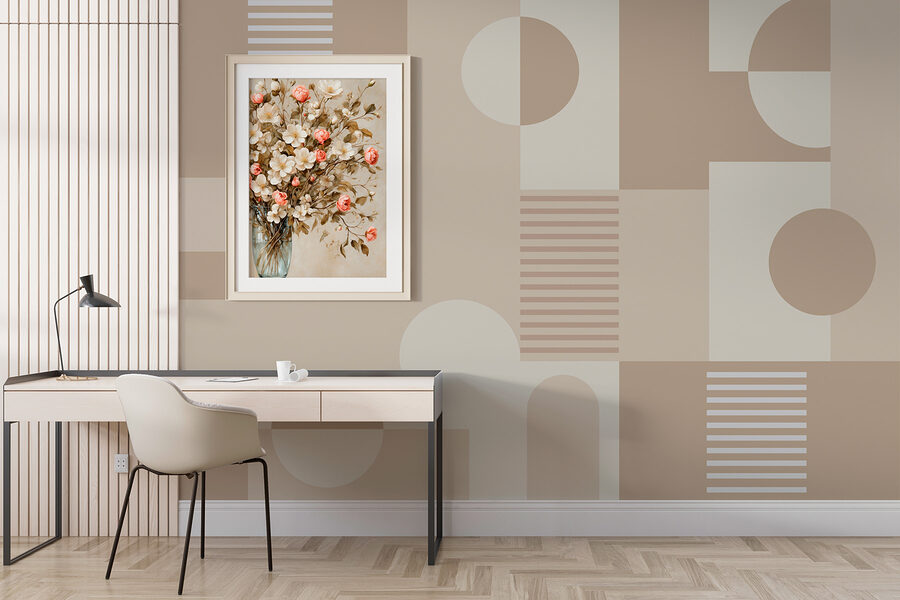 Premeňte akúkoľvek miestnosť na útulné útočisko pomocou tejto nástennej maľby “Vzor geometrických tvarov”. Predstavte si, že sa každé ráno zobudíte a po stenách vám budú tancovať jemné, neutrálne tóny – také upokojujúce, že možno zabudnete, že ste sa zobudili. Hravá zmes obdĺžnikov a kruhov dokáže vyvolať radosť aj v tých najponurejších priestoroch, napríklad v tom kúte, ktorý ignorujete od septembra minulého roka.