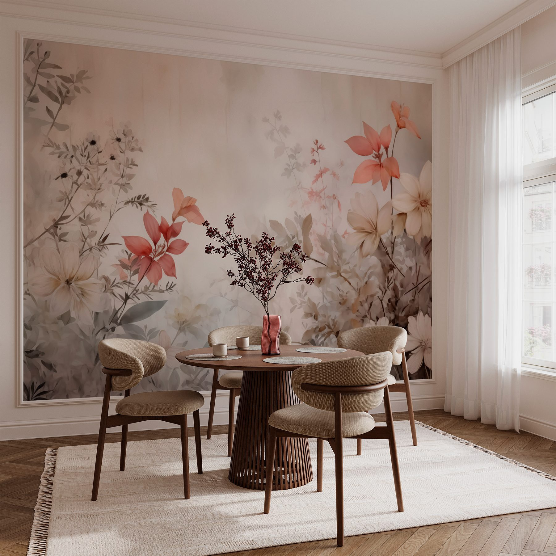 Premeňte každú stenu na pokojnú oázu pomocou tejto očarujúcej nástennej maľby s kvetmi. Predstavte si, že vstúpite do sna, kde jemné kvety tancujú v nežných odtieňoch a vytvárajú atmosféru, ktorá je upokojujúca a povznášajúca. Je to ako vniesť do interiéru závan čerstvého vzduchu – ideálne pre útulný čitateľský kútik alebo pokojnú vstupnú halu. Akvarelový efekt dodáva kvetinám plynulý pôvab, takmer ako ľahký vánok, ktorý sa preháňa záhradou. Priatelia sa možno zastavia a spýtajú sa, či niekto nenechal dvere do prírody dokorán. Ideálne pre tých, ktorí ocenia trochu kvetinovej atmosféry bez starostlivosti o skutočné rastliny!