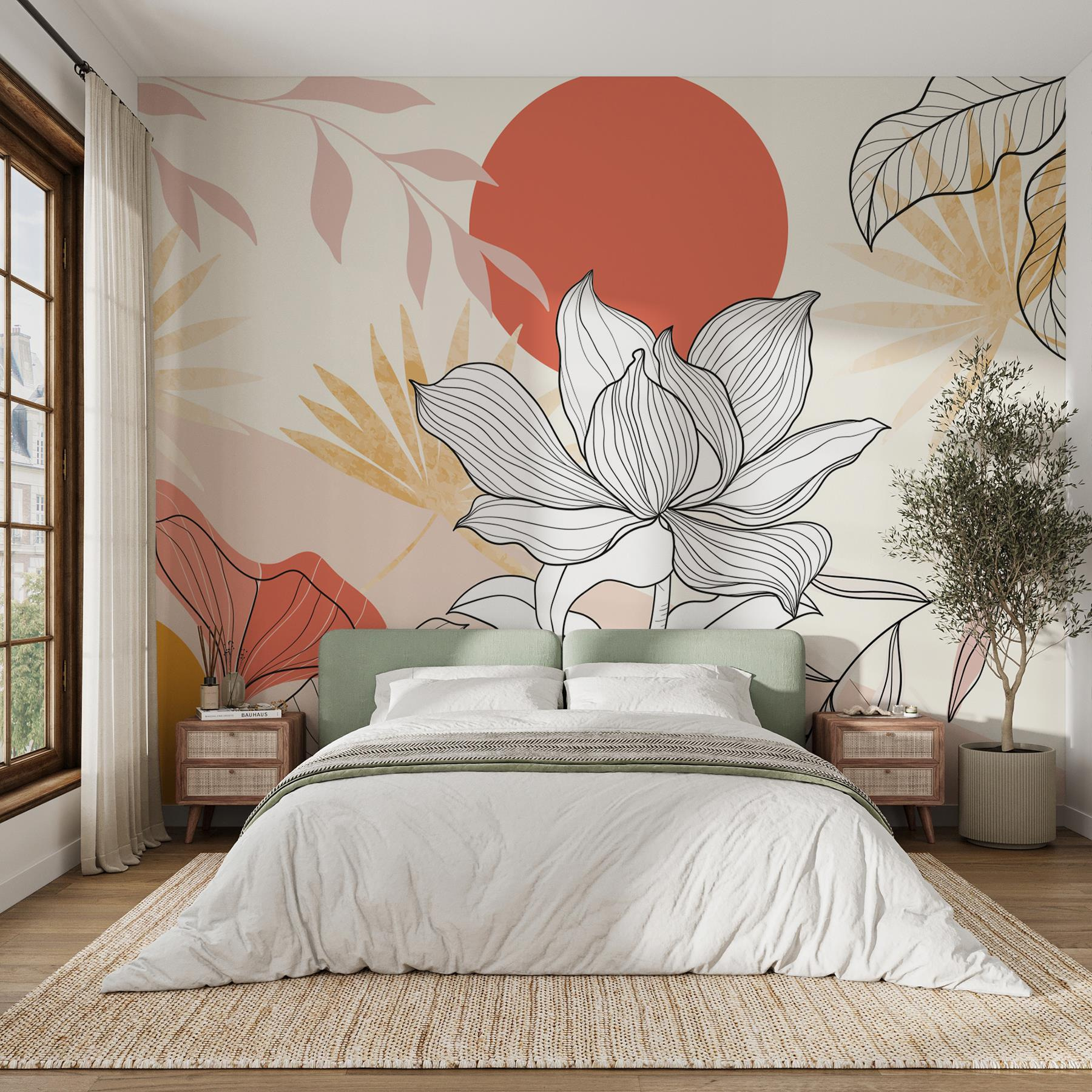 Rozžiarte svoje steny touto krásnou nástennou maľbou s kvetmi a listami tancujúcimi pod teplým červeným slnkom. Akoby ste do interiéru preniesli kúsok prírody – samozrejme, bez chrobákov. Predstavte si to: popíjanie kávy pri nasávaní žiarivých farieb; je to ako mini dovolenka priamo u vás doma. Zmes jemných pastelových farieb a výraznej červenej vytvára takú útulnú a zároveň energickú atmosféru. Zoberte svojich priateľov na nezáväzný rozhovor a sledujte, ako sa rozjasnia pri obdivovaní umenia. Ideálne do každej miestnosti, ktorá potrebuje štipku osobnosti. Kto by nechcel botanický únik?