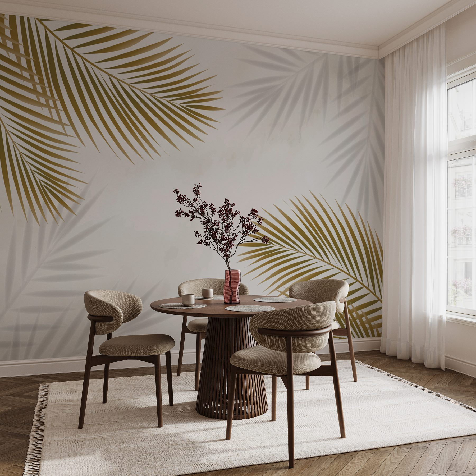 Premeňte svoj priestor na tropický únik s touto úžasnou nástennou maľbou so skupinou listov tancujúcich na jemnom bielom pozadí. Predstavte si, že vojdete do svojej izby a privíta vás jemné kolísanie palmových listov, akoby ste vstúpili priamo do pokojnej oázy. Je to jemné, ale pôsobivé – ideálne na vnesenie dotyku prírody do interiéru bez starostí so zalievaním rastlín! Táto nástenná maľba dodáva osviežujúcu atmosféru, či už v útulnej obývačke alebo pokojnej spálni. Priatelia si váš domov môžu pomýliť s elegantným ostrovným oddychom – popíjanie kokosovej vody je úplne dobrovoľné, ale veľmi odporúčané!