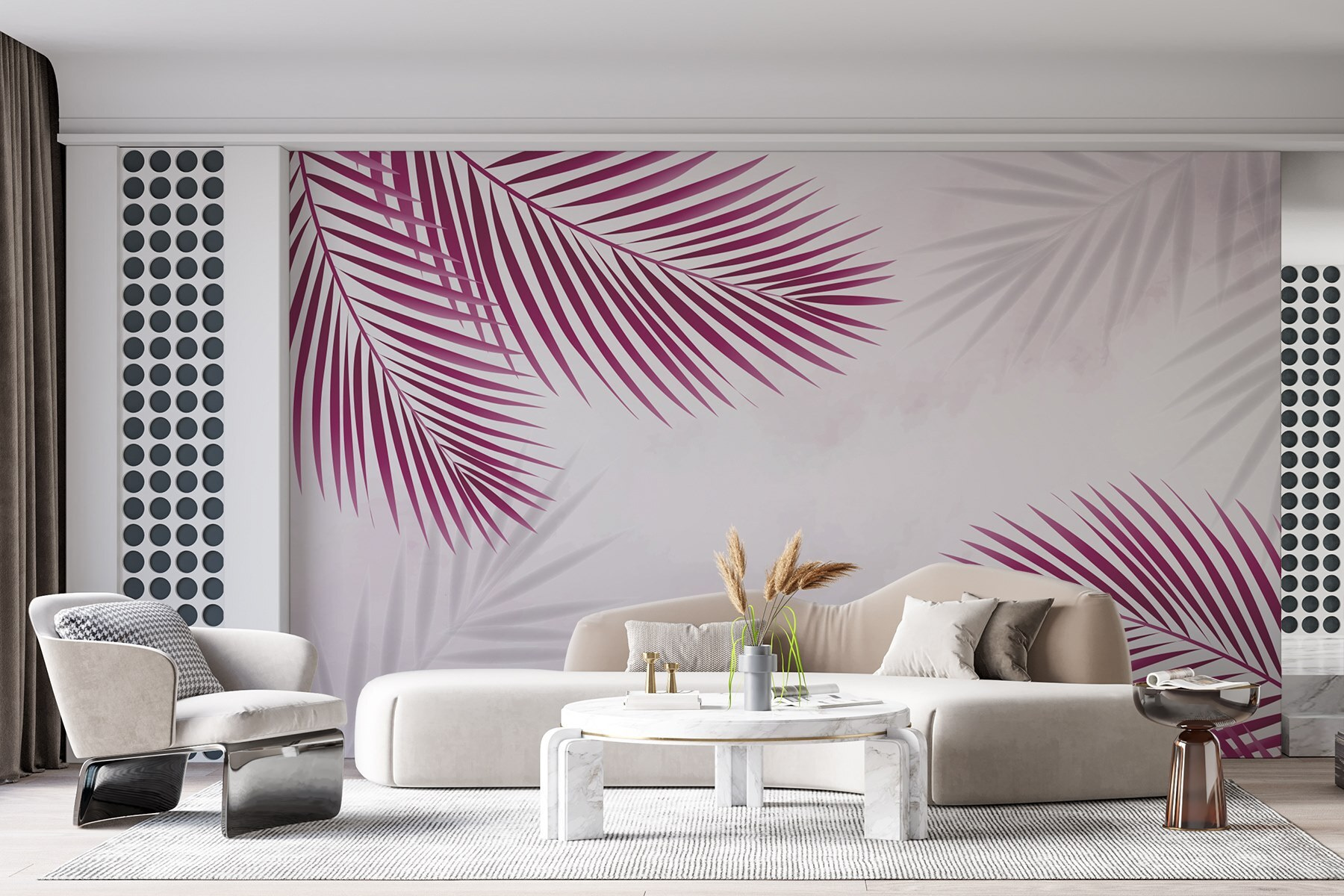 Premeňte akýkoľvek priestor pomocou tejto žiarivej nástennej maľby s úžasnými fialovými listami na sviežom bielom pozadí. Predstavte si, že vojdete do miestnosti a budete sa cítiť ako na tropickej dovolenke bez toho, aby ste si museli baliť kufor. Tieto odvážne listy upútajú pozornosť a vytvárajú pocit energie – ideálne do živej kuchyne alebo útulného obývacieho priestoru.