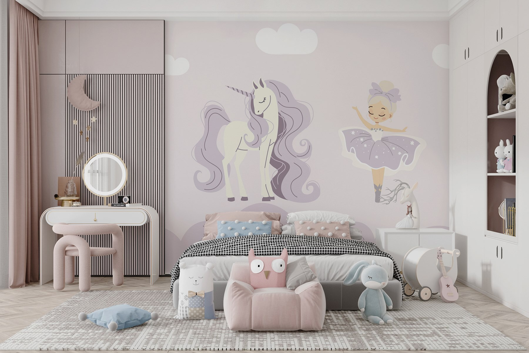 S nástennou maľbou “Jednorožec a baletka” premeníte akýkoľvek priestor na rozmarnú krajinu zázrakov. Predstavte si to: rozkošný jednorožec a pôvabná baletka tancujú na zasnenej pastelovej oblohe. Je to ako mať kúsok kúzla priamo na stene! Deti (a povedzme si úprimne, aj dospelí) sa môžu stratiť vo svojej fantázii a snívať o víroch a trblietaní. Táto fototapeta je ideálna do detskej izby alebo spálne, vďaka nej sa aj tá najnudnejšia stena bude cítiť ako v rozprávke. Len si predstavte tie úsmevy, keď sa priatelia zastavia – každý miluje dobré rozprávky o jednorožcoch, však? Je jemná, očarujúca a taká inšpirujúca – dokonalé pozadie pre dobrodružstvá a sny!