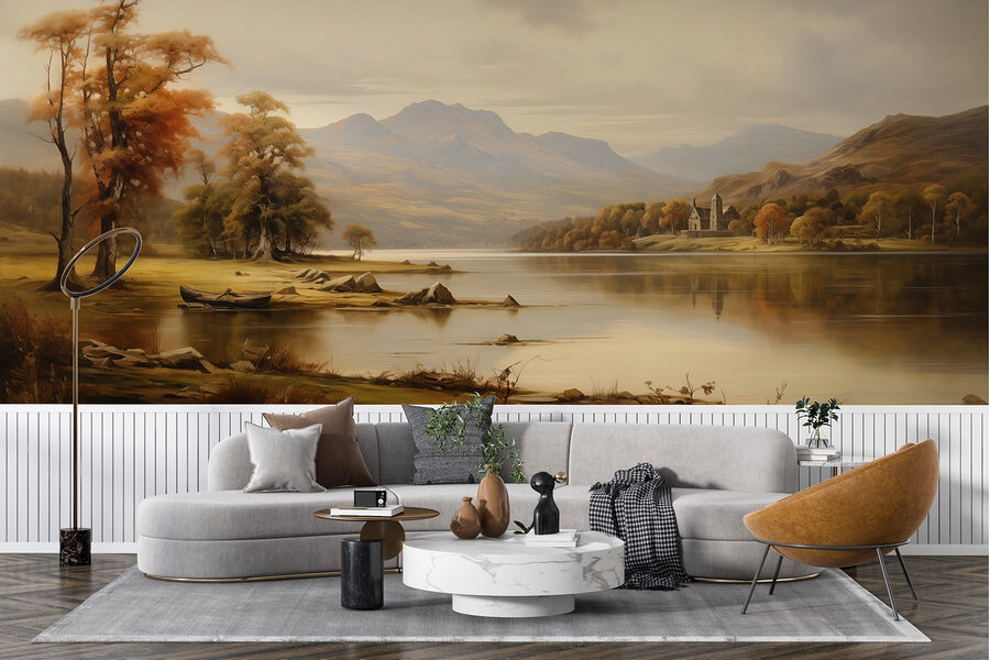 Premeňte akýkoľvek priestor na pokojný útek s touto úžasnou nástennou maľbou s pokojným jazerom obklopeným majestátnymi stromami a horami. Predstavte si, že sa každý deň prebúdzate do tejto pokojnej scény a máte pocit, že ste vstúpili priamo do náručia prírody. Teplé odtiene navodzujú pocit pokoja, zatiaľ čo jemné vlnky na vode vyvolávajú malé snenie. Či už ide o útulnú obývačku alebo upokojujúcu spálňu, táto nástenná maľba našepkáva relaxáciu. Môže dokonca inšpirovať k spontánnej víkendovej túre – len sa pripravte na zablatené topánky po nej!