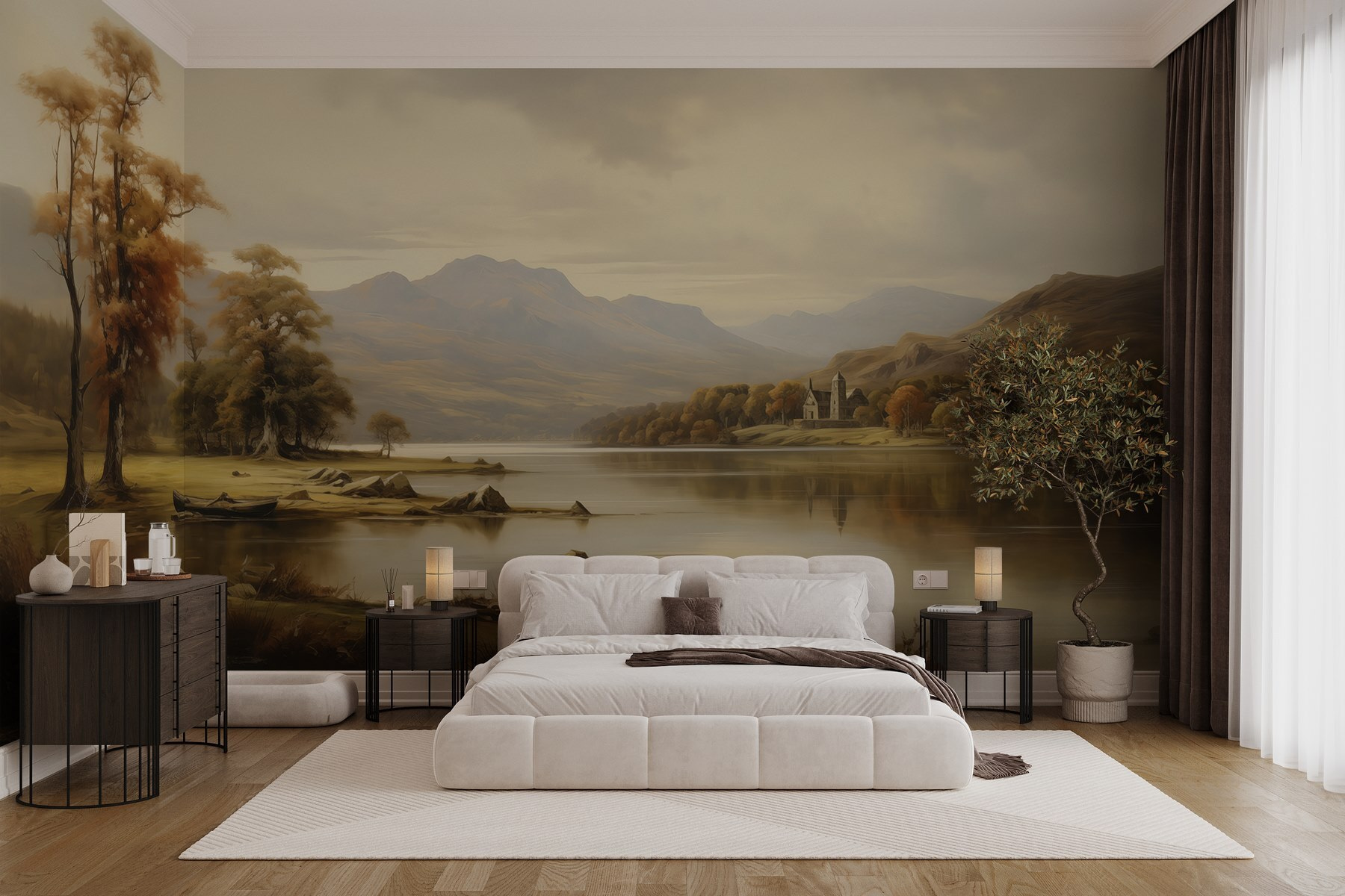 Premeňte akýkoľvek priestor na pokojný útek s touto úžasnou nástennou maľbou s pokojným jazerom obklopeným majestátnymi stromami a horami. Predstavte si, že sa každý deň prebúdzate do tejto pokojnej scény a máte pocit, že ste vstúpili priamo do náručia prírody. Teplé odtiene navodzujú pocit pokoja, zatiaľ čo jemné vlnky na vode vyvolávajú malé snenie. Či už ide o útulnú obývačku alebo upokojujúcu spálňu, táto nástenná maľba našepkáva relaxáciu. Môže dokonca inšpirovať k spontánnej víkendovej túre – len sa pripravte na zablatené topánky po nej!