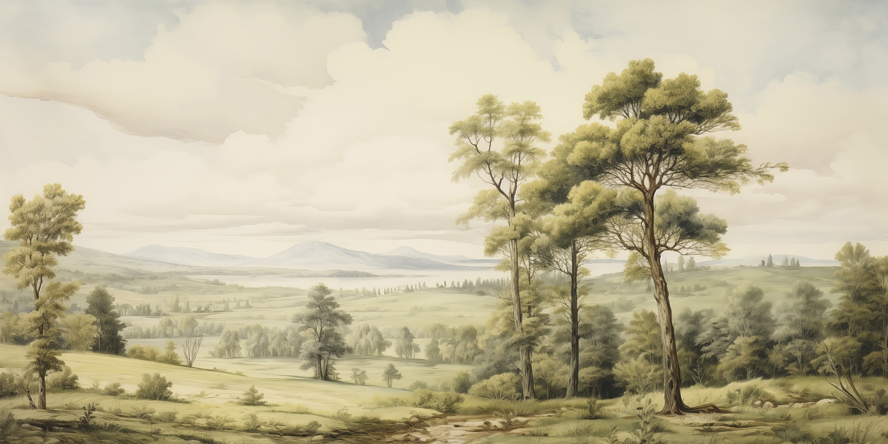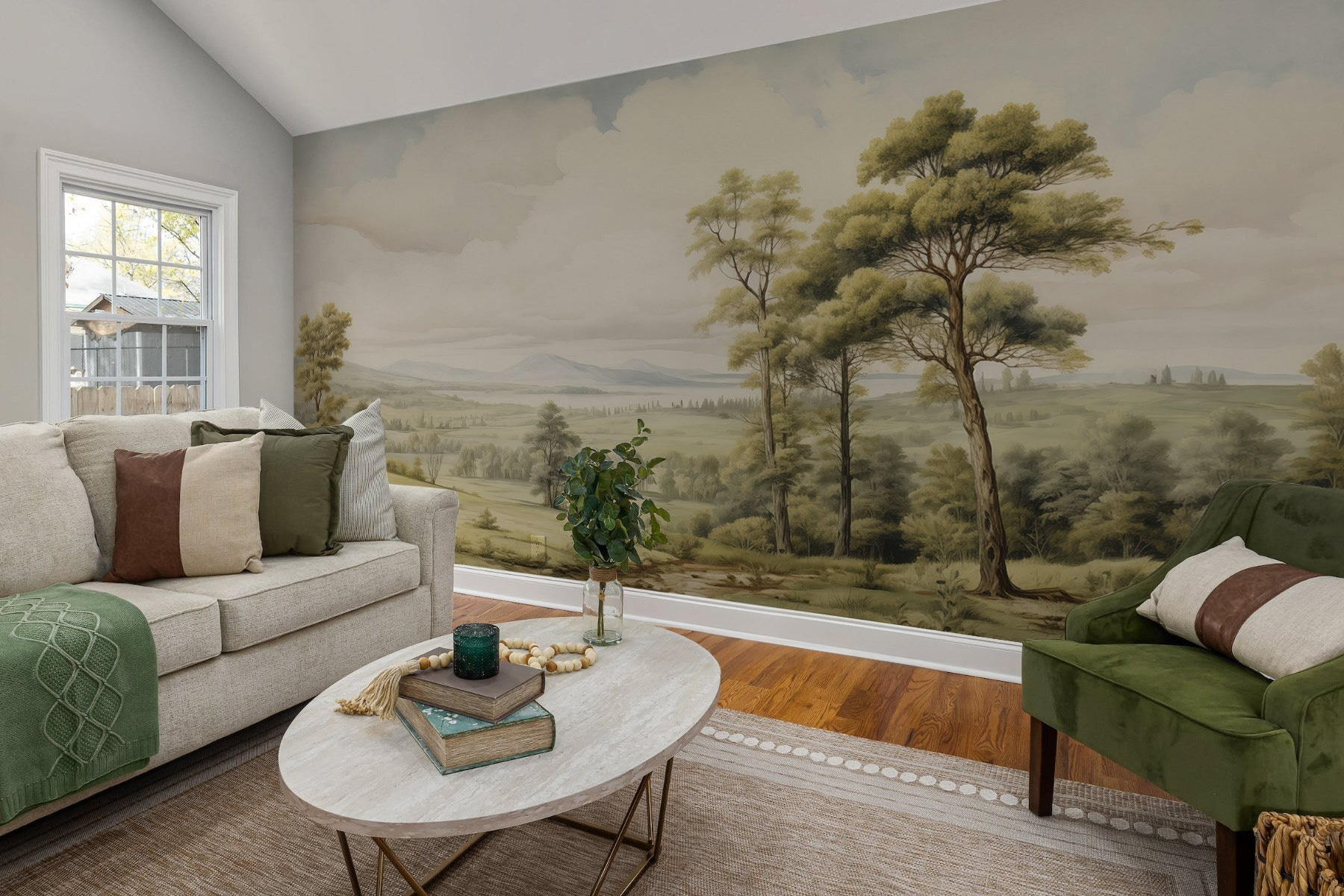 Premeňte svoj priestor s touto úžasnou nástennou maľbou „Krajina so stromami a kopcami“. Predstavte si, že vstúpite do pokojnej krajiny, kde sa mierne kopce stretávajú s vysokými stromami – presne to, čo izba potrebuje, aby získala nádych prírody. Je to ako priniesť vonkajšiu prírodu dovnútra bez starostí o polievanie rastlín alebo otravný hmyz. Predstavte si útulný kútik na čítanie, kde táto tapeta vytvára perfektné pozadie, alebo možno jedálenský kút, ktorý pôsobí ako elegantný piknik. Jemné farby upokojujú a zároveň podnecujú k rozhovoru. Priatelia sa vás možno dokonca opýtajú, či sa môžu nasťahovať. Je to dekor, ktorý pozýva k sneniu a rozprávaniu príbehov – kto by to nemiloval? Pripravte sa vdýchnuť svojim stenám nový život!