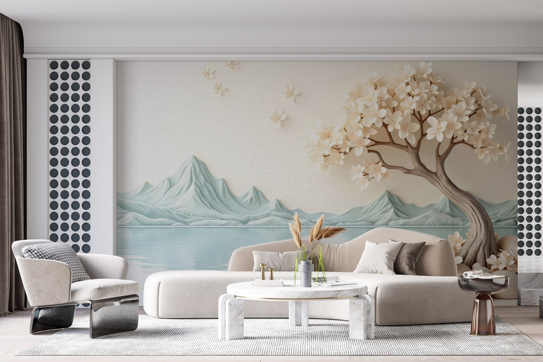 Premeňte svoj priestor na pokojné útočisko s touto úžasnou nástennou maľbou „Strom s kvetmi a kameňmi pri vode“. Predstavte si to: krásne vyrezávaný strom, ktorý je obsypaný jemnými kvetmi a elegantne sa nakláňa nad pokojnú vodnú hladinu. Je to ako pozvať kúsok prírody priamo do vašej obývačky. Jemné farby a jemné línie okamžite prinášajú pokojnú atmosféru, ideálnu na posedenie s šálkou čaju – alebo možno aj s nejakým chutným občerstvením. A buďme úprimní, kto nepotrebuje pokojné pozadie pri sledovaní svojich obľúbených seriálov? Táto fototapeta je viac ako dekorácia; je to každodenná pripomienka, aby sme si vážili malé veci, ako je krása kvetu alebo tichý okamih pri vode.