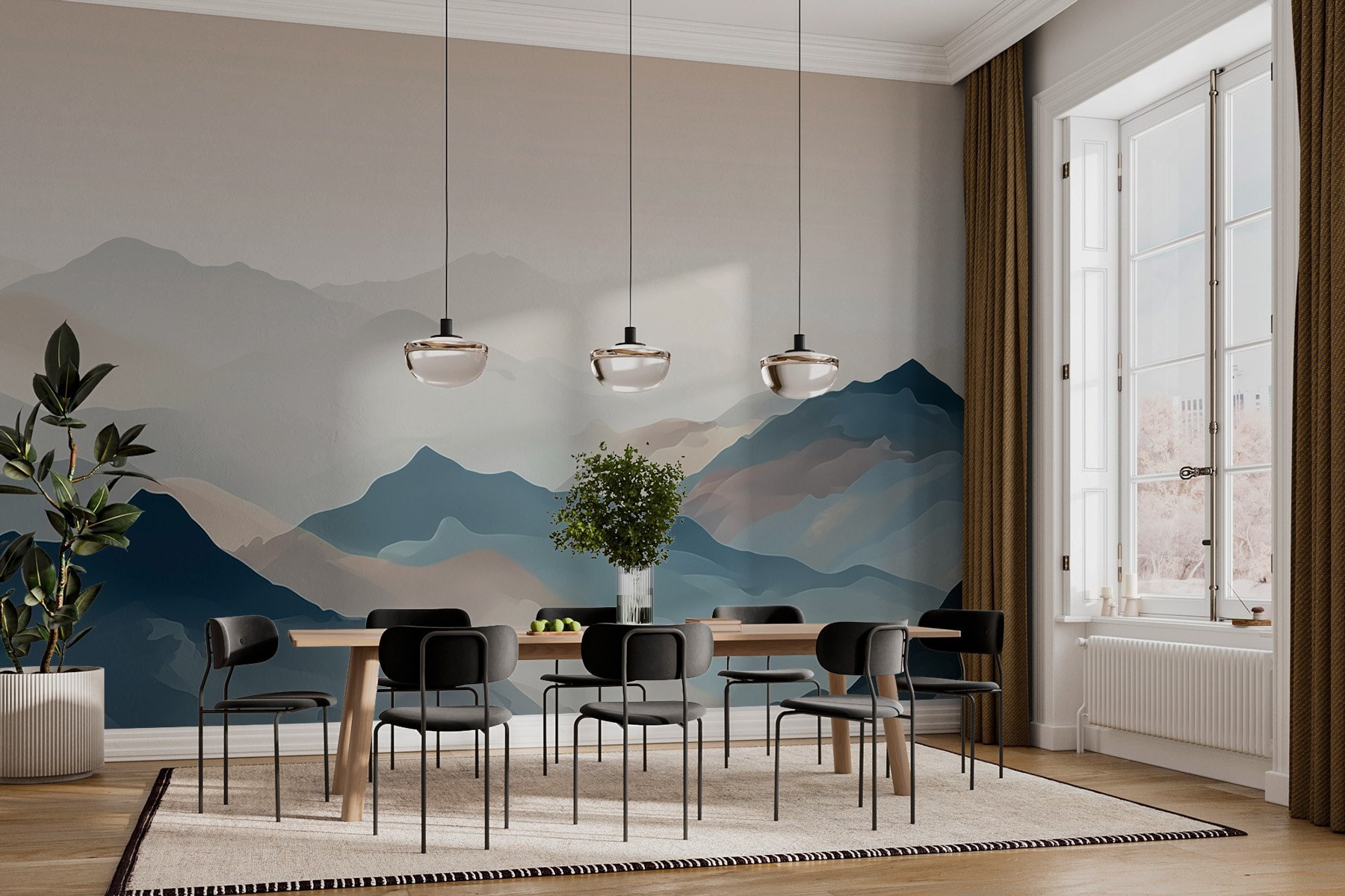 Predstavte si, že sa prebudíte v útulnej chate, slnko presvitá cez stromy a máte pocit, ako keby ste sledovali, ako hory ožívajú priamo pred vašimi očami. Táto „nástenná maľba horského masívu s hmlou“ úžasne zachytáva túto snovú atmosféru. Jemné akvarelové ťahy spájajú odtiene modrej a zemité tóny, čím vytvárajú atmosféru, ktorá šepká pokoj a mier. Je to ako jemné objatie vašich stien. Predstavte si to v kútiku na čítanie – zahnutí s dobrou knihou a teplým nápojom, úplne ponorení do pokojného výhľadu. Budete mať pocit, ako keby ste boli na nekonečnom dobrodružstve, aj keď len ležíte doma. Žiadne horolezecké vybavenie nie je potrebné!