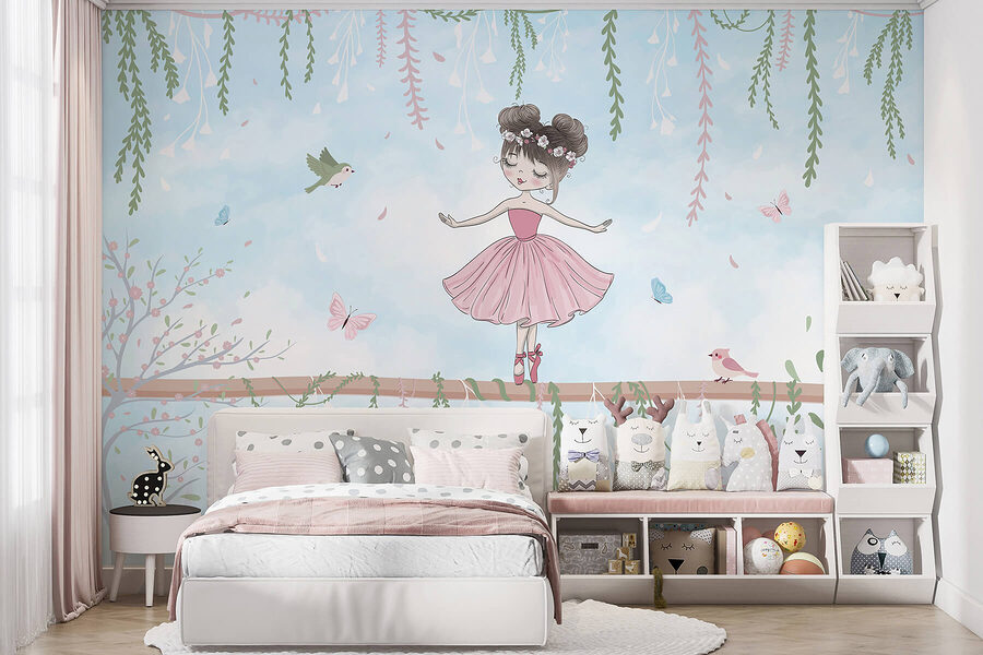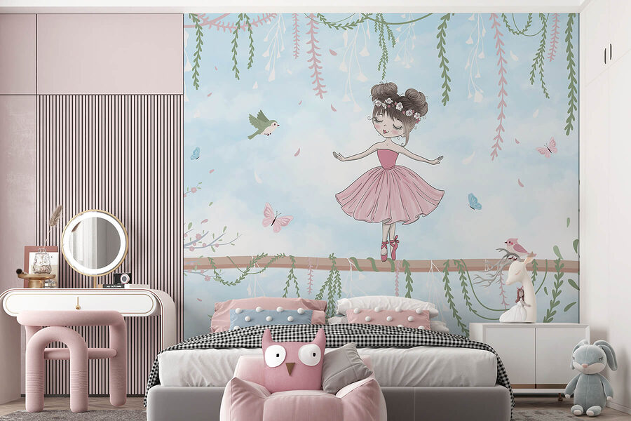 Vstúpte do rozprávkového sveta s touto očarujúcou nástennou maľbou, na ktorej je zobrazená očarujúca dievčina v ružových šatách, dokonale vyvážená na konári. Obklopená poletujúcimi motýľmi a hravými vtákmi, je to ako scéna priamo z rozprávky. Predstavte si, ako rozžiari útulný kútik na čítanie alebo rozžiari radosť v detskej izbe. Jemné farby a fantazijné detaily vyvolávajú úsmev a každý pohľad je ako teplé objatie. Predstavte si, ako popíjate čaj, hľadíte na jej eleganciu a necháte sa uniesť príbehmi, ktoré inšpiruje – kto by to nechcel? Táto nástenná maľba nie je len dekoráciou, je to magický únik!