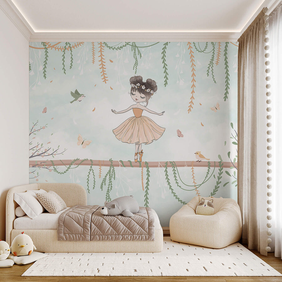 Predstavte si rozprávkový únik priamo na vašich stenách! Táto očarujúca nástenná maľba zobrazuje rozkošné dievčatko tancujúce na konári, obklopené poletujúcimi motýľmi a zvedavými vtákmi. Jemné pastelové pozadie vytvára pokojnú atmosféru, vďaka ktorej sa každá miestnosť premení na rozprávkový lesný úkryt. Je ideálna na rozvíjanie detskej fantázie alebo jednoducho na dodanie kúsku kúzla do detskej izby alebo herne. Predstavte si, ako sa čítanie rozprávok premení na dobrodružstvo, keď deti hľadia na túto očarujúcu scénu a úplne sa stratia v jej kráse. Naozaj, kto by sa nechcel spolu s ňou veselo točiť? Trochu radosti pre steny, ktoré volajú po úsmeve!