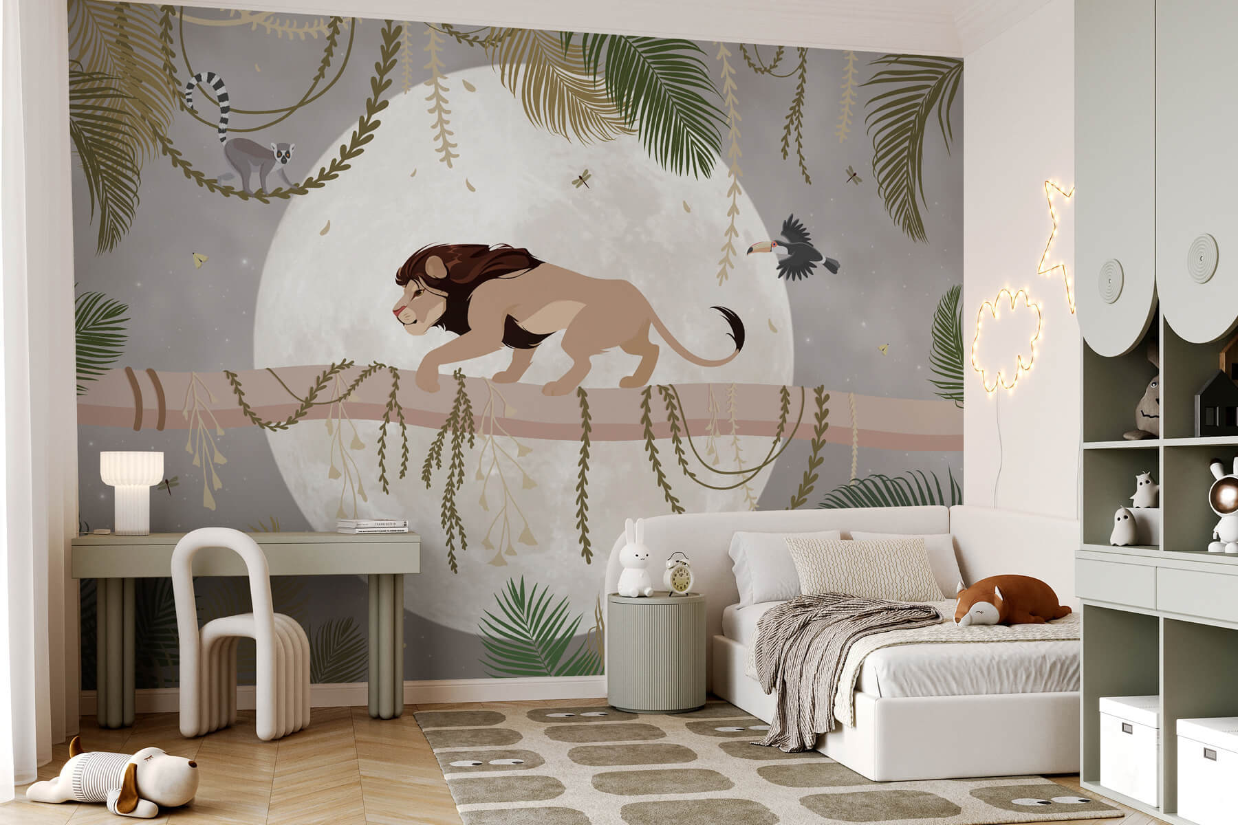 Introducing a mural that’s all about wild charm—meet the “Lion on a Tree Branch.” Imagine this regal creature strutting confidently across a branch, framed by swaying leaves and a dreamy moon. It’s like bringing a piece of the tropics right into your living room. Every glance delivers a splash of adventure, don’t you think?