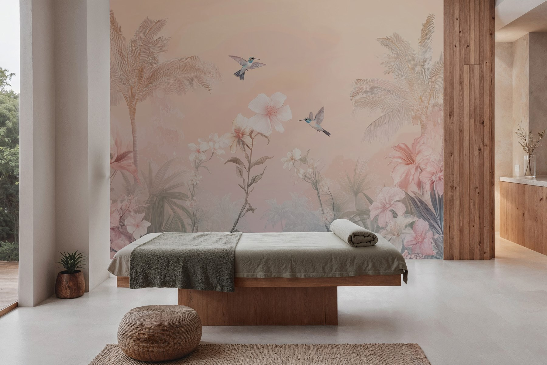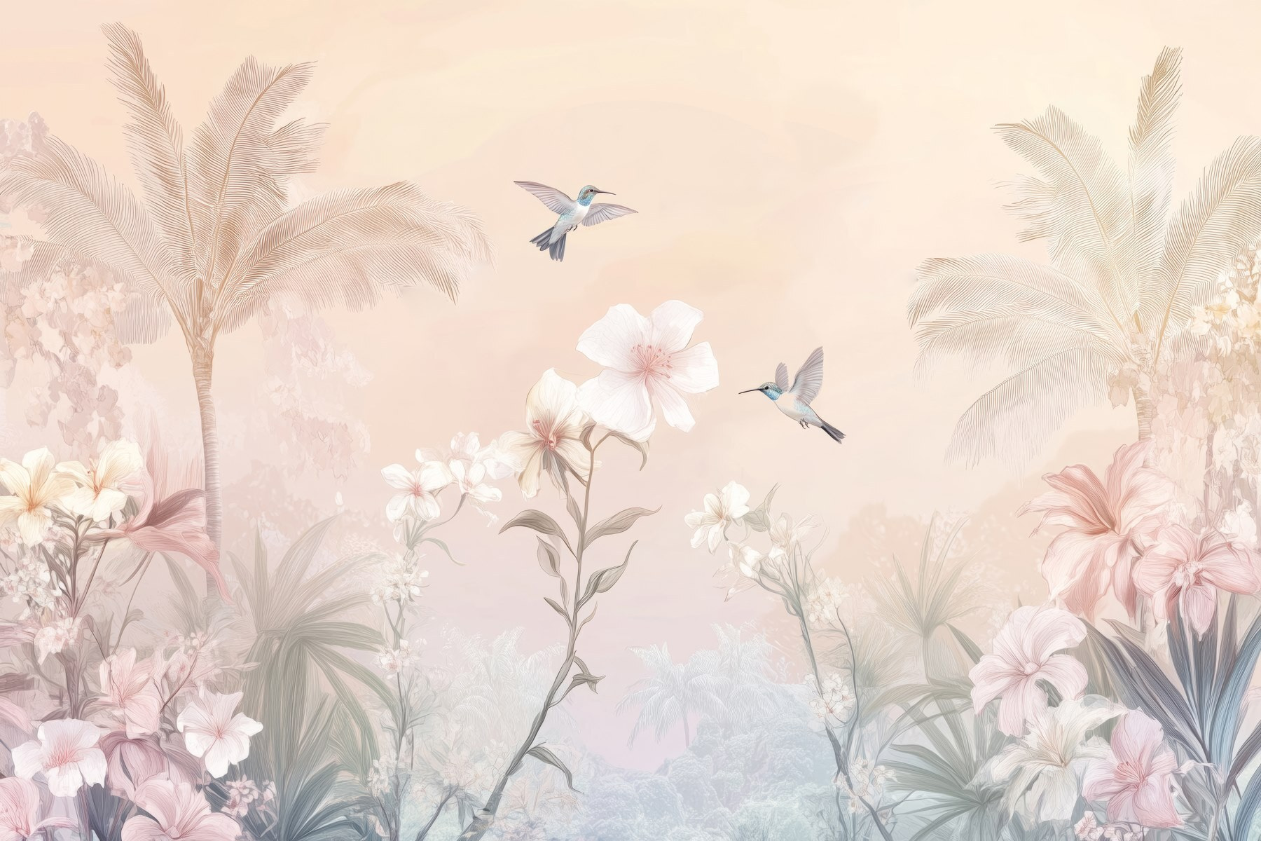 Premeňte svoj priestor s touto očarujúcou nástennou maľbou „Skupina vtákov lietajúcich nad kvetmi“. Predstavte si to: živé vtáky lietajúce nad bujnými kvetmi, ktoré prinášajú kúsok prírody priamo do vášho domova. Nie je to len obyčajná dekorácia na stenu, ale každodenná pripomienka krásy za vašimi štyrmi stenami. Predstavte si, ako popíjate kávu a snívate, zatiaľ čo hľadíte na tento tropický zázrak. Jemné farby vytvárajú príjemnú atmosféru, vďaka čomu je táto tapeta perfektným pozadím pre útulné posedenia alebo tiché chvíle o samote. Je to ako malý kúsok raja – len bez piesku! Kvety šepkajú príbehy o teplom vánku a tie vtáky? Tie by mohli inšpirovať spontánnu tanečnú párty. Ponorte sa do tohto kvetinového raja!
