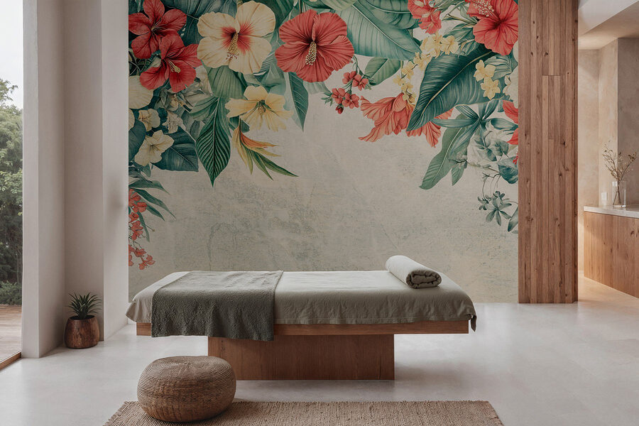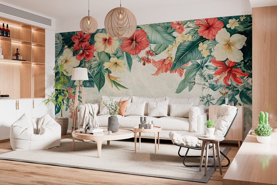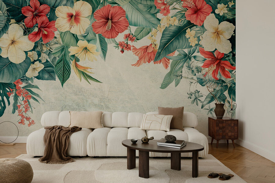 Premeňte svoj priestor na tropický raj s touto nástennou maľbou „Živé kvety rámujú pokojné pozadie“. Predstavte si to: vojdete do svojej izby a bum! Privítajú vás kvety prekypujúce farbami, ako keby sa jarný deň natrvalo usadil na vašej stene. Kombinácia červeného ibišteka, krémovej žltej a tmavozelenej farby vytvára zmyslový zážitok – je to ako konfety prírody. Predstavte si, ako tu popíjate rannú kávu; ľahko zabudnete na vonkajší svet. Navyše, prináša dovolenkovú atmosféru priamo do vášho domova, bez potreby opaľovacieho krému. Táto tapeta je ideálna do obývacej izby alebo útulného kútika a má charakter a šarm. Kto by nechcel kúsok prírodnej krásy zarámovaný s takým vkusom?