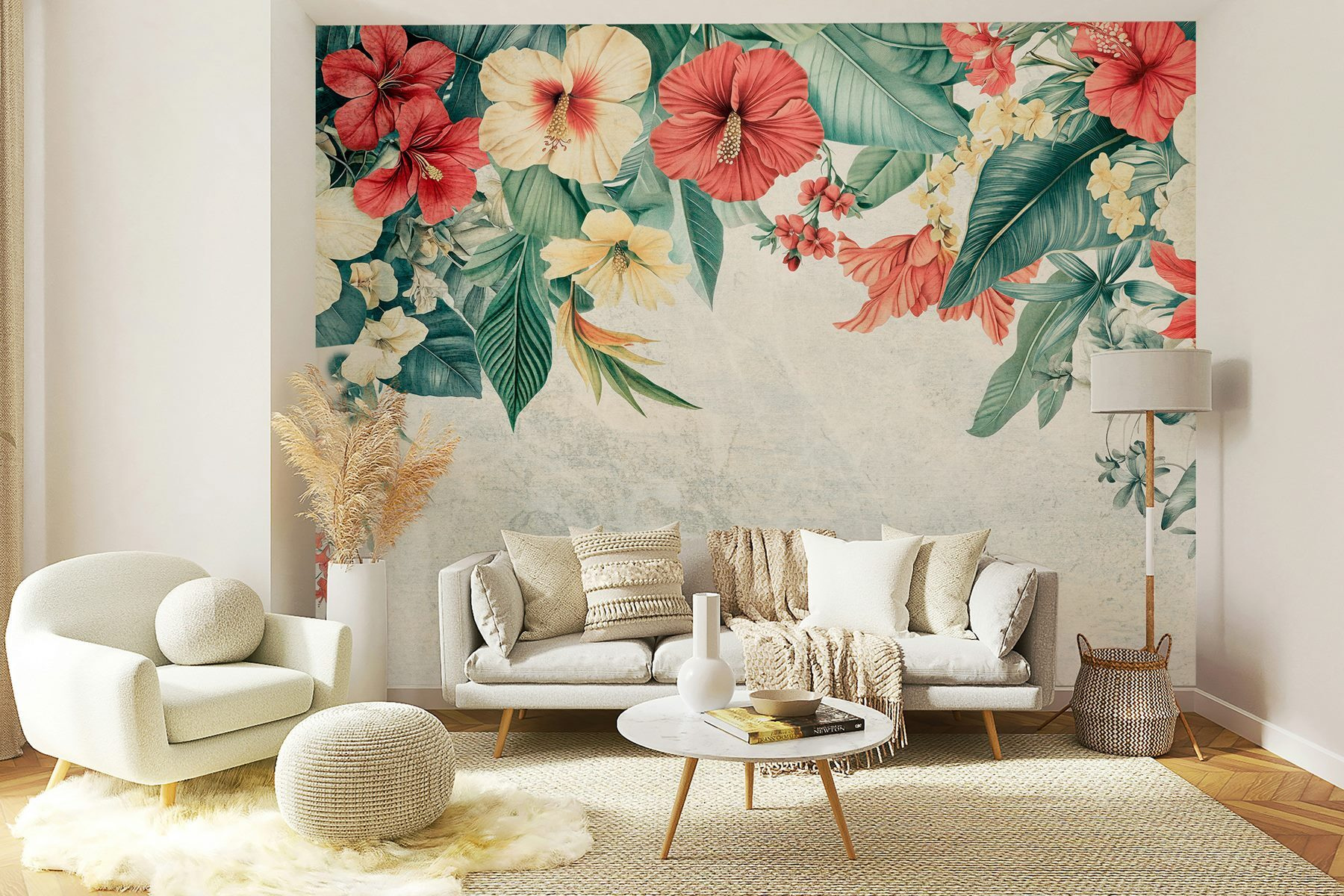 Premeňte svoj priestor na tropický raj s touto nástennou maľbou „Živé kvety rámujú pokojné pozadie“. Predstavte si to: vojdete do svojej izby a bum! Privítajú vás kvety prekypujúce farbami, ako keby sa jarný deň natrvalo usadil na vašej stene. Kombinácia červeného ibišteka, krémovej žltej a tmavozelenej farby vytvára zmyslový zážitok – je to ako konfety prírody. Predstavte si, ako tu popíjate rannú kávu; ľahko zabudnete na vonkajší svet. Navyše, prináša dovolenkovú atmosféru priamo do vášho domova, bez potreby opaľovacieho krému. Táto tapeta je ideálna do obývacej izby alebo útulného kútika a má charakter a šarm. Kto by nechcel kúsok prírodnej krásy zarámovaný s takým vkusom?