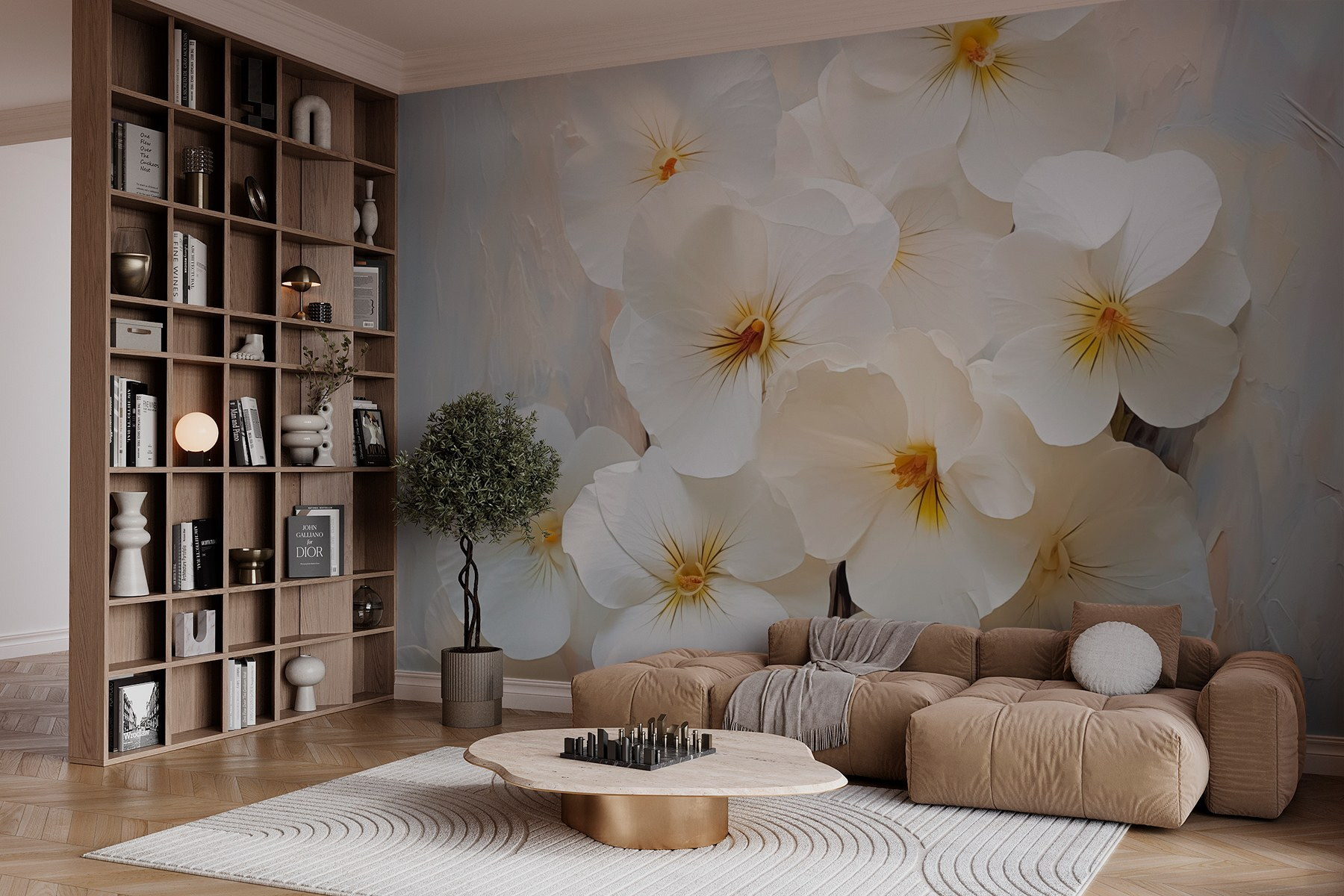 Premeňte svoj priestor na pokojnú záhradu pomocou nástennej maľby Skupina bielych kvetov. Predstavte si, že popíjate rannú kávu obklopení jemnými okvetnými lístkami, akoby do vnútra vstúpila samotná príroda. Tieto kvety vnesú do každej miestnosti nádych pokoja a elegancie, vďaka čomu sa v nej budete cítiť ako počas jasného jarného dňa. Jemné biele odtiene nádherne tancujú na svetlom pozadí a vyzývajú oko, aby sa na nich zdržalo. Či už je to v útulnom kútiku alebo v živom obývacom priestore, táto nástenná maľba šepká k srdcu a každému pripomína, že krása je vzdialená len na pohľad. Je ideálna na snívanie, rozhovory alebo jednoducho na vychutnávanie tichej chvíle.
