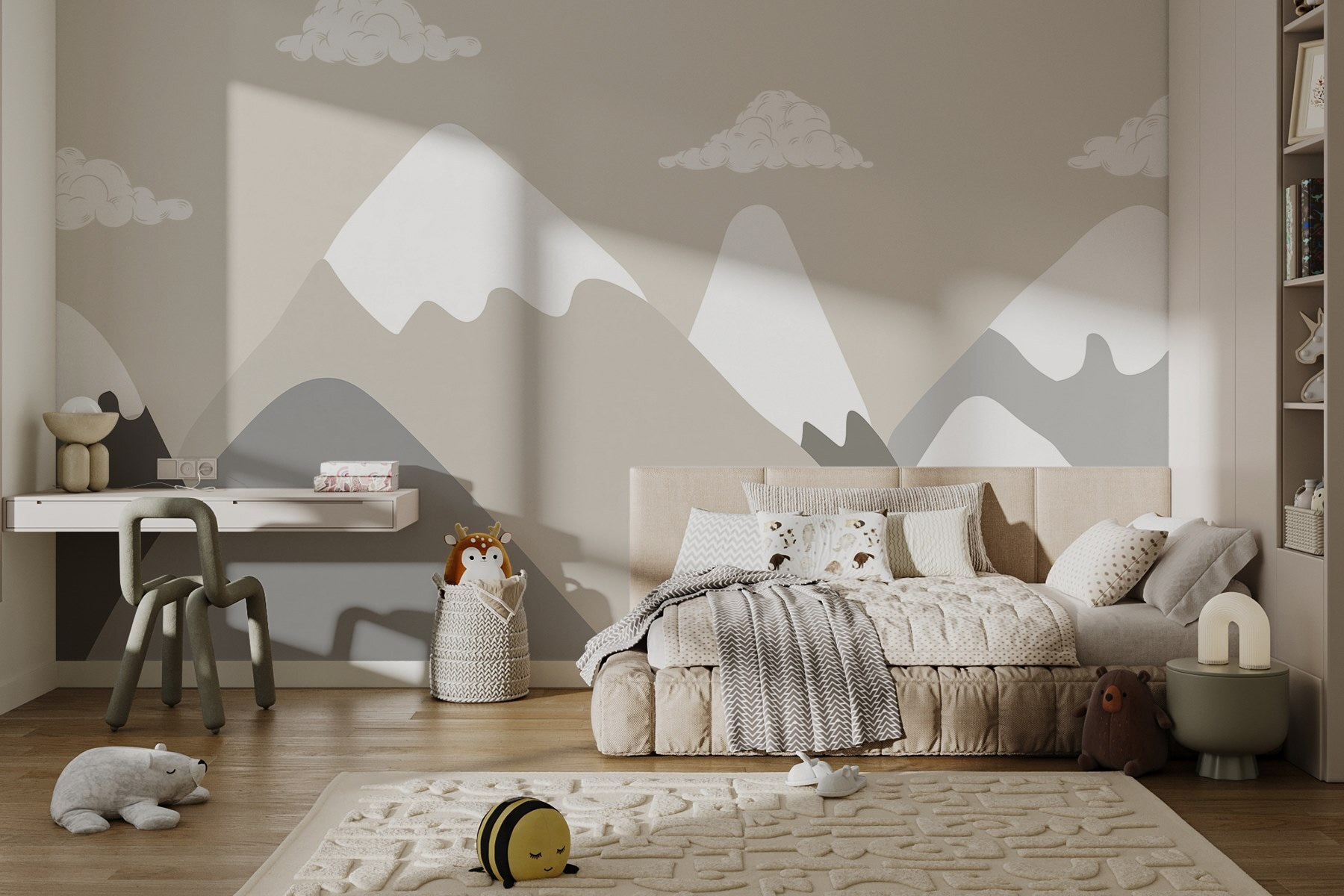 Premeňte svoj priestor s touto úžasnou nástennou maľbou horského masívu, kde nad pokojnými vrcholkami tancujú jemné oblaky. Je to ako mať miniatúrny únik priamo na stene! Predstavte si, ako popíjate kávu a hľadíte na tie nádherné, vlniace sa hory. Nie sú len pekné, ale vyvolávajú snenie a túžbu po cestovaní. Navyše, tlmené farby sa perfektne hodia do každej miestnosti. Či už je to obývačka, útulný kútik na čítanie alebo dokonca domáca pracovňa, táto nástenná maľba prináša upokojujúcu atmosféru. Je to spôsob, akým príroda hovorí: „Zhlboka sa nadýchnite a relaxujte.“ Len si predstavte – každý deň by mohol začínať a končiť takýmto výhľadom.