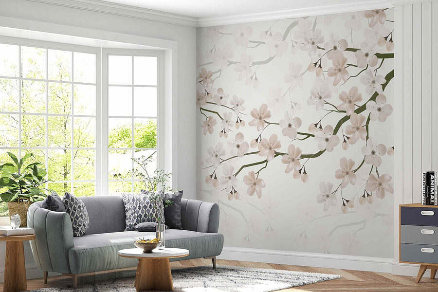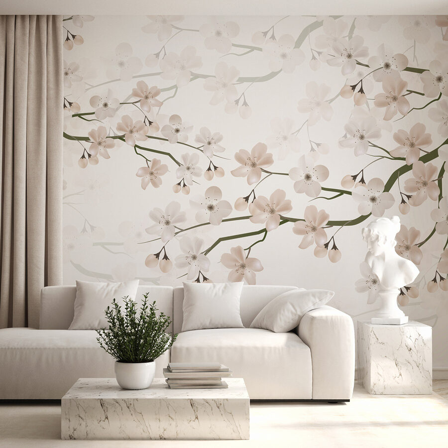 Predstavte si, že vstúpite do miestnosti, ktorá pôsobí ako pokojná záhrada v plnom kvete – práve to vám ponúka tapeta „Biele kvety na konári“. Svojimi jemnými kvetmi a mäkkými farbami táto tapeta bez námahy rozžiari každý priestor a premení obyčajné na mimoriadne. Je to, ako keby kvety šepkali sladké ničoty vašim stenám.