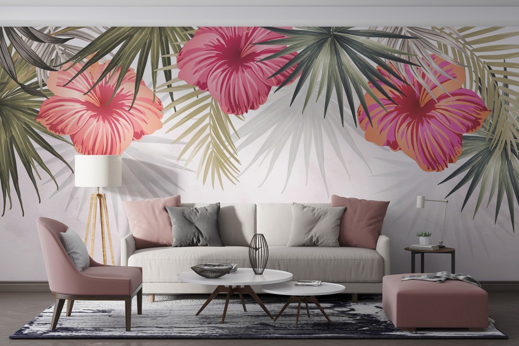 Transform any room into a tropical paradise with this stunning mural of pink flowers mingling with lush green leaves. It feels like a little slice of nature right in your home, perfect for brightening up a dull space. Imagine having morning coffee while surrounded by these vibrant blooms—might even inspire some daydreaming! The colors pop against a soft background, making it a statement piece without screaming for attention. Sure, plants need watering, but this beauty’s low-maintenance! Perfect for those seeking a hint of the outdoors—without worrying about plant care. So, go ahead, let your walls bloom!