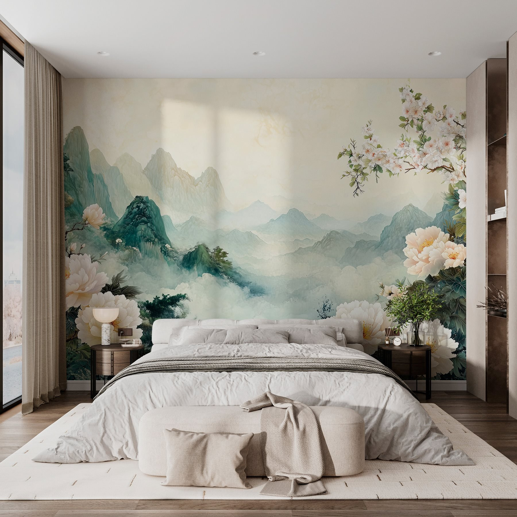 Premeňte svoj priestor pomocou tejto očarujúcej nástennej maľby s jemnými kvetmi a majestátnymi horami. Predstavte si, že vojdete do miestnosti, kde jemné kvety akoby šepkali tajomstvá pokojných záhrad, zatiaľ čo vzdialené vrcholy evokujú pocit dobrodružstva. Predstavte si, ako relaxujete na pohovke a popíjate čaj – máte pocit, že ste priamo v pokojnej japonskej záhrade. Táto nástenná maľba nie je len umením, ale vnáša pokoj prírody do interiéru a pozýva k teplu a úžasu. Či už ide o útulné zákutie alebo živú obývačku, dodáva jej charakter a iskrí radosťou pri každom pohľade. Kúsok na rozhovor? Určite!