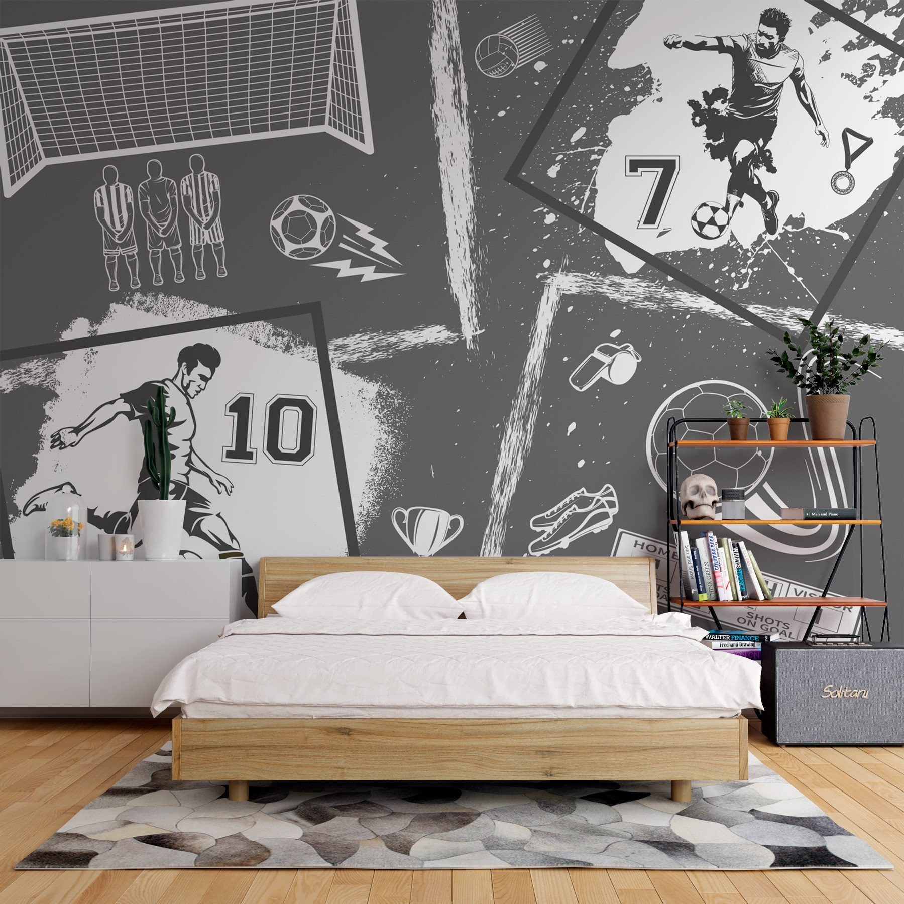 Každý detail vyzýva k rozhovoru. Od ikonického čísla 10 po tabuľu s výsledkami, ktorá všetkým pripomenie tie napínavé závery – je to pastva pre oči a lístok do nostalgie. Či už ide o detskú izbu, mužskú jaskyňu alebo dokonca útulný kútik vo vašej obývačke, táto nástenná maľba dodá priestoru športový nádych – považujte ju za povzbudenie pre priestor! Kto by nezažil nával vzrušenia pri pohľade na tieto pôsobivé vizuály? Pripravte sa na oddych a vychutnajte si futbalového ducha!