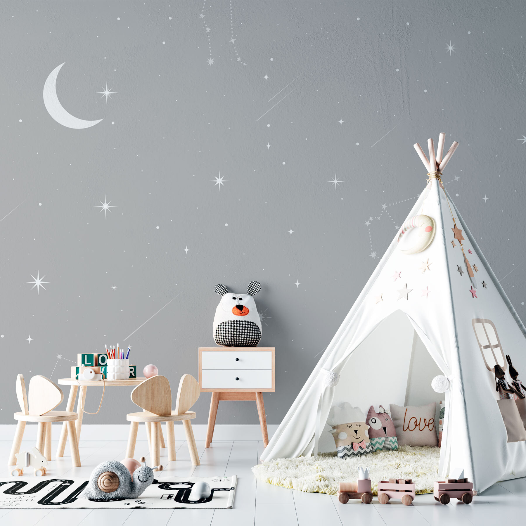Premeňte obyčajnú miestnosť na zasnený únik s nástennou maľbou Sivá obloha s hviezdami a mesiacom. Predstavte si, že vstúpite do svojho priestoru a privíta vás pokojná nočná obloha s blikajúcimi hviezdami a jemným mesiacom. Je to ako pozvať do interiéru kúsok mágie. Ideálne pre útulné večery strávené popíjaním čaju alebo nočnými rozhovormi pod hviezdami – bez chladného vzduchu. Navyše, kto by nemiloval ten pocit, keď sa pri leňošení na gauči pozerá na súhvezdia? Pozdvihnite svoj interiér bez námahy a užite si dotyk vesmíru priamo u vás doma!