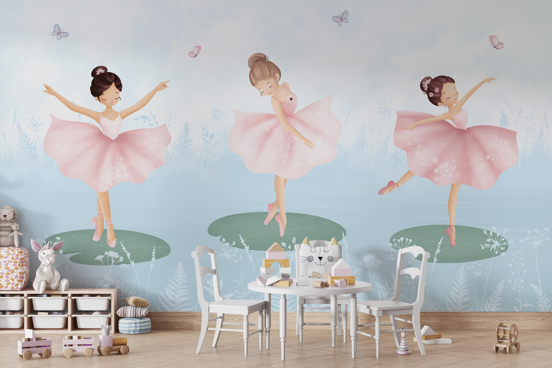 Premeňte detskú izbu na čarovnú krajinu zázrakov s touto rozmarnou fototapetou s trojicou pôvabných dievčatiek tancujúcich v ružových tutu na leknách. Predstavte si ten chichot, keď si deti všimnú motýle, ktoré poletujú okolo, a pridajú tak do ich hry kúzlo. Je to ako pozvať si rozprávku priamo domov. Táto nástenná maľba, ktorá je ideálna na rozprúdenie fantázie počas rozprávky alebo len na oživenie útulného kútika, prináša hravú atmosféru, ktorá dokáže vyčariť úsmev na tvári každému. Len si to predstavte – tancujúce topánky, smiech a kvapka radosti pri každom pohľade.