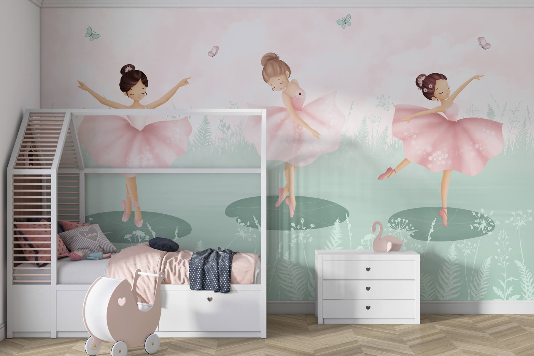 Premeňte svoj priestor pomocou tejto očarujúcej nástennej maľby s rozkošnou skupinou dievčat tancujúcich na slnkom zaliatom poli. Je to ako scéna priamo z rozmarného snenia, kde smiech napĺňa vzduch a motýle poletujú okolo. Predstavte si drobné nožičky, ktoré sa krútia a víria v týchto jemných ružových tutu, čo evokuje pocit radosti a bezstarostnosti. Táto nástenná maľba je ideálna do detskej izby, pretože podporuje kreativitu a predstavivosť. Len si predstavte úsmevy a rozprávanie príbehov, ktoré by sa tu mohli odohrávať, keď sa malí tanečníci podelia o svoje vlastné dobrodružstvá plné zábavy a priateľstva. Prskavka šťastia na každú stenu!