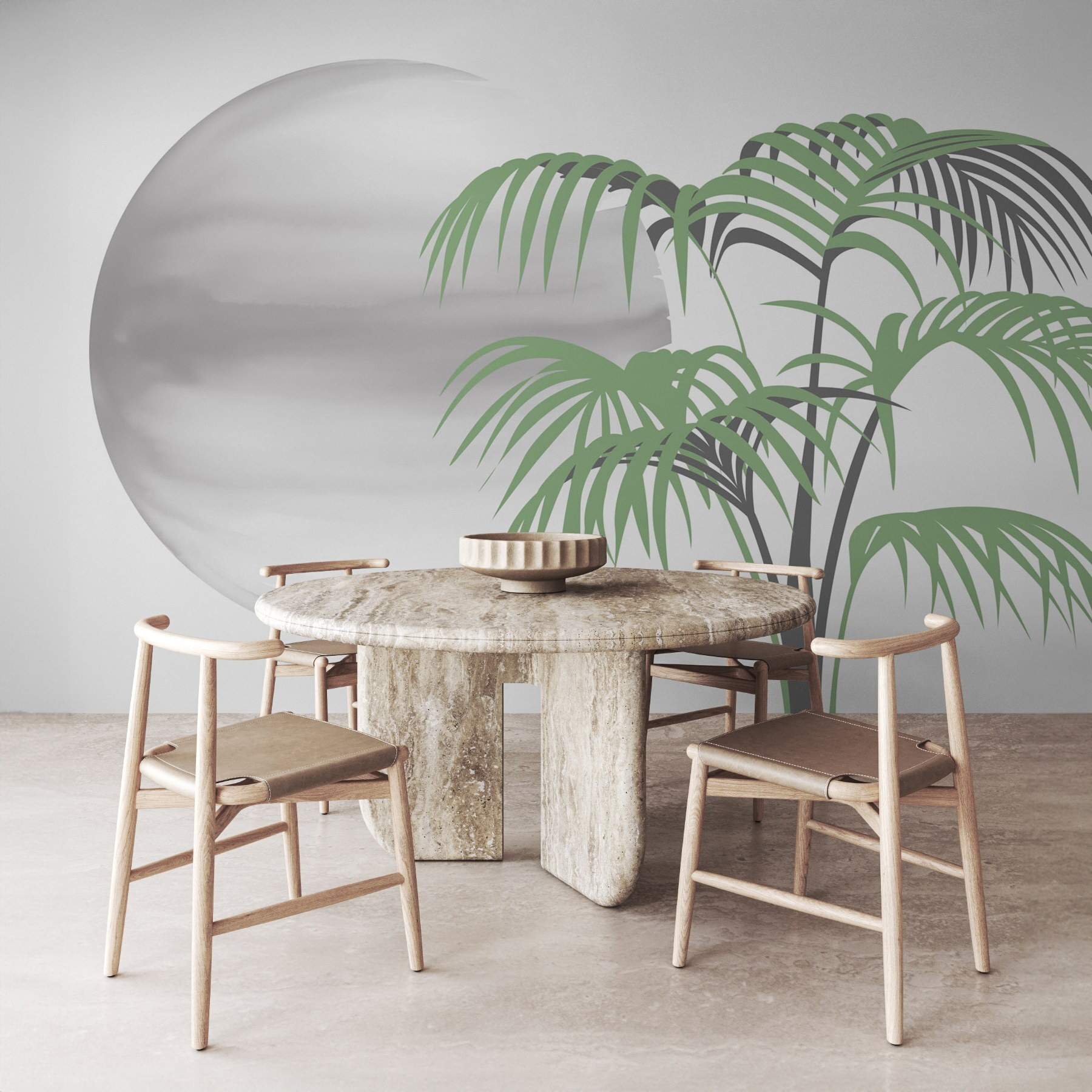 Premeňte akúkoľvek miestnosť na tropickú oázu s touto úžasnou nástennou maľbou s palmami a jemnou, okrúhlou bielou guľou. Je to ako priniesť kúsok raja priamo do vášho obývacieho priestoru. Predstavte si, ako si pohodlne sadnete s knihou, zatiaľ čo pokojné pozadie vám šepká: „Hej, život je ako pláž!“ Farebná paleta je pokojná, ale svieža, ideálna pre dni, keď si chcete len oddýchnuť. Či už je to obývačka alebo domáca pracovňa, táto nástenná maľba vyvoláva pocit pokoja a každý deň sa tak stáva ako malá dovolenka. Kto by to nechcel? Zdobte, relaxujte a uniknite bez toho, aby ste museli opustiť dom.