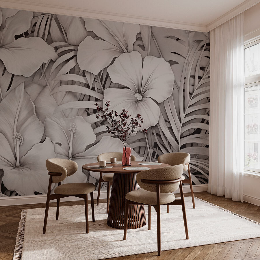Premeňte akúkoľvek miestnosť s touto ohromujúcou nástennou maľbou, ktorá sa vyznačuje elegantným kvetinovým vzorom v upokojujúcich monochromatických tónoch. Predstavte si, že vstúpite do svojej miestnosti a privítajú vás bujné listy a kvety – je to ako mať priamo doma malý tropický únik. Táto maľba je ideálna na vytvorenie pokojnej atmosféry a bez námahy spája krásu prírody s moderným štýlom.