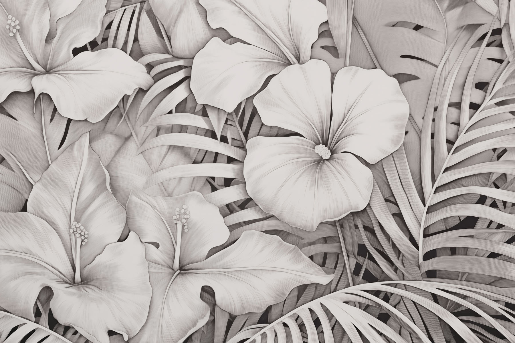 Premeňte akúkoľvek miestnosť s touto ohromujúcou nástennou maľbou, ktorá sa vyznačuje elegantným kvetinovým vzorom v upokojujúcich monochromatických tónoch. Predstavte si, že vstúpite do svojej miestnosti a privítajú vás bujné listy a kvety – je to ako mať priamo doma malý tropický únik. Táto maľba je ideálna na vytvorenie pokojnej atmosféry a bez námahy spája krásu prírody s moderným štýlom.