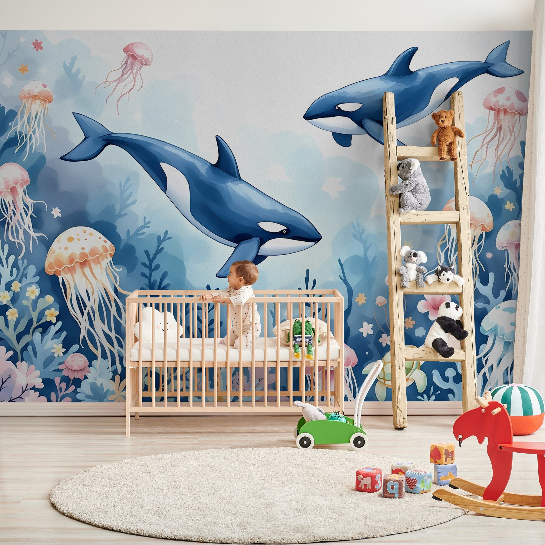 Transform your space into an underwater wonderland with this enchanting wall mural featuring whales and a playful turtle frolicking through vibrant ocean waters. Imagine stepping into a room where jellyfish drift lazily, and colorful corals sway like they’re dancing. It’s like having your own slice of the sea right at home! Perfect for coastal vibes, this mural will have you daydreaming of beach days and ocean breezes. Who wouldn’t smile seeing turtles go about their business in a sea of serenity? This artwork is not just decor; it’s an invitation to escape and explore—no scuba gear required!