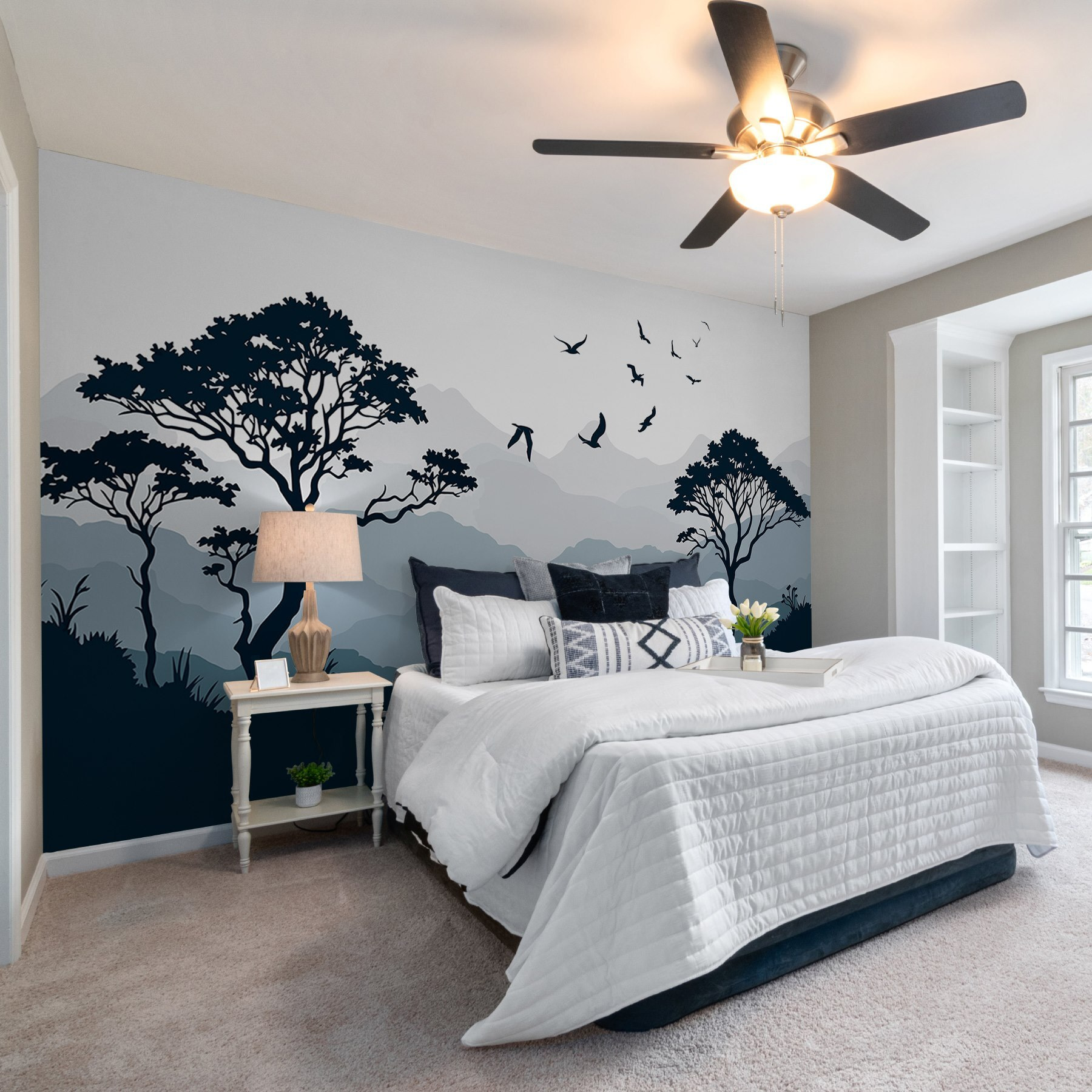 Premeňte svoj priestor pomocou úžasnej nástenné maľby „Vtáky lietajúce nad horským masívom“. Predstavte si túto pokojnú scénu obklopujúcu vaše steny a vytvárajúcu pokojnú atmosféru, o ktorej ste ani nevedeli, že ju potrebujete. Jemné odtiene hôr a stromov vyvolávajú pocit pokoja, takmer ako mini dovolenka bez balenia kufrov! Zakaždým, keď sa na ňu pozriete, zdá sa, že tie vtáky šepkajú slobodu.