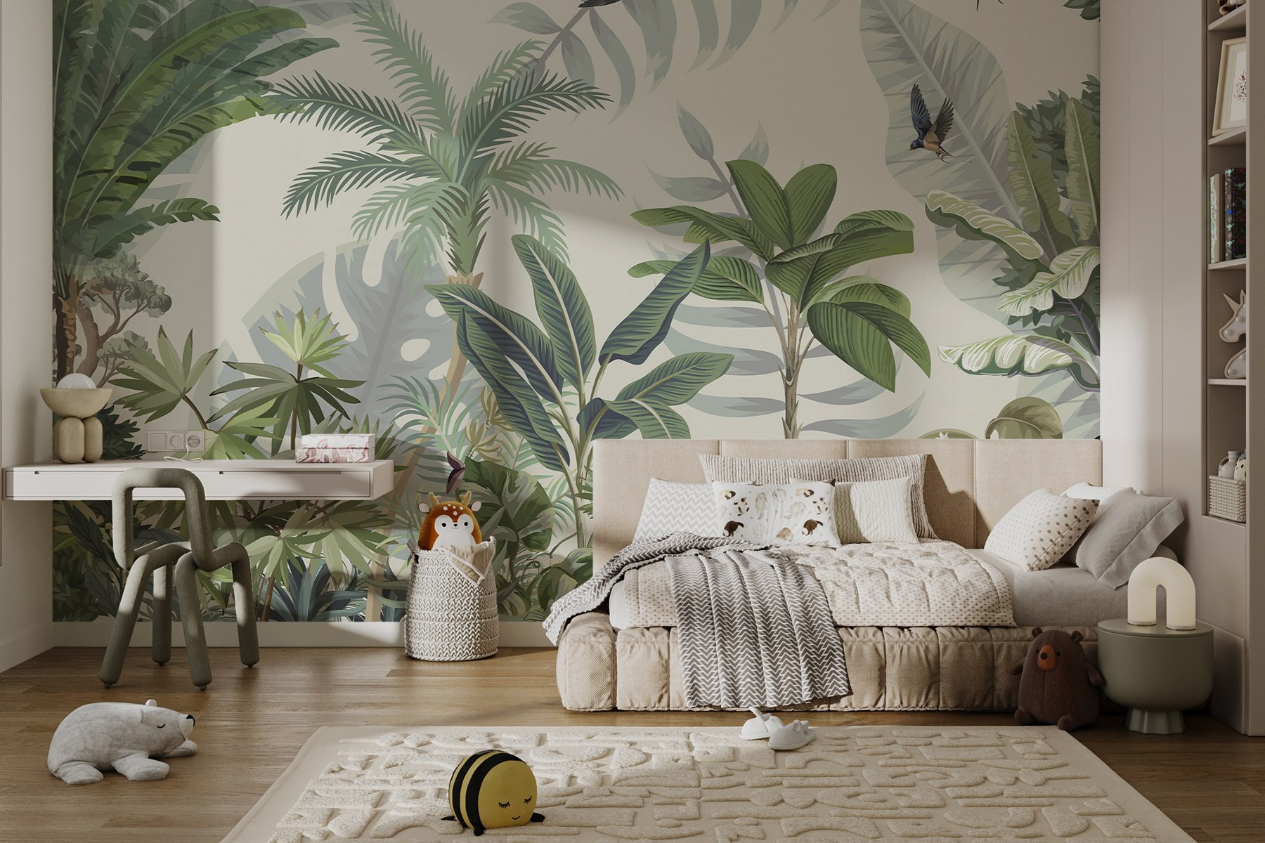 Premeňte obyčajnú stenu na bujný raj s touto tropickou nástennou maľbou! Predstavte si sviežu zeleň a veselé vtáky poletujúce okolo – je to ako priniesť si malý dažďový prales priamo do vášho obývacieho priestoru. Predstavte si, ako popíjate rannú kávu, zatiaľ čo vás táto tapeta prenesie do slnkom zaliatej džungle. Ukludňujúce farby a bohaté detaily vyžarujú teplo a relax. Navyše je to skvelý spúšťač konverzácie! Či už ste milovníkom prírody alebo len potrebujete oživiť svoj domov, táto tapeta dodá každému trochu viac dobrodružného ducha – kto by povedal, že steny môžu byť tak vzrušujúce?