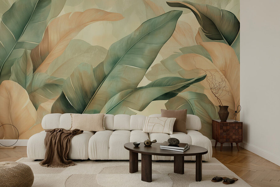 Premeňte svoj priestor pomocou žiarivej nástennej maľby “Bujné listy v jemných odtieňoch”. Predstavte si, že zakaždým, keď vstúpite do miestnosti, vstúpite do tropickej oázy – táto bohatá listnatá zeleň dokáže pozvať do vonkajšieho prostredia. Mäkké broskyňové tóny presvitajú a dodávajú kúsok tepla, ktoré je to pravé pre každý kút. Je to ako zavesiť si na stenu kúsok prírody bez starostí so zalievaním rastlín. Perfektne sa hodí na oživenie útulnej obývačky alebo oživenie čitateľského kútika. Predstavte si, ako popíjate svoj obľúbený nápoj obklopení touto sviežou atmosférou alebo hostíte priateľov, ktorí nemôžu neobdivovať túto krásu. Je to viac ako dekorácia, je to dobrý pocit, ktorý môže dokonca inšpirovať snívanie o vzdialených miestach.