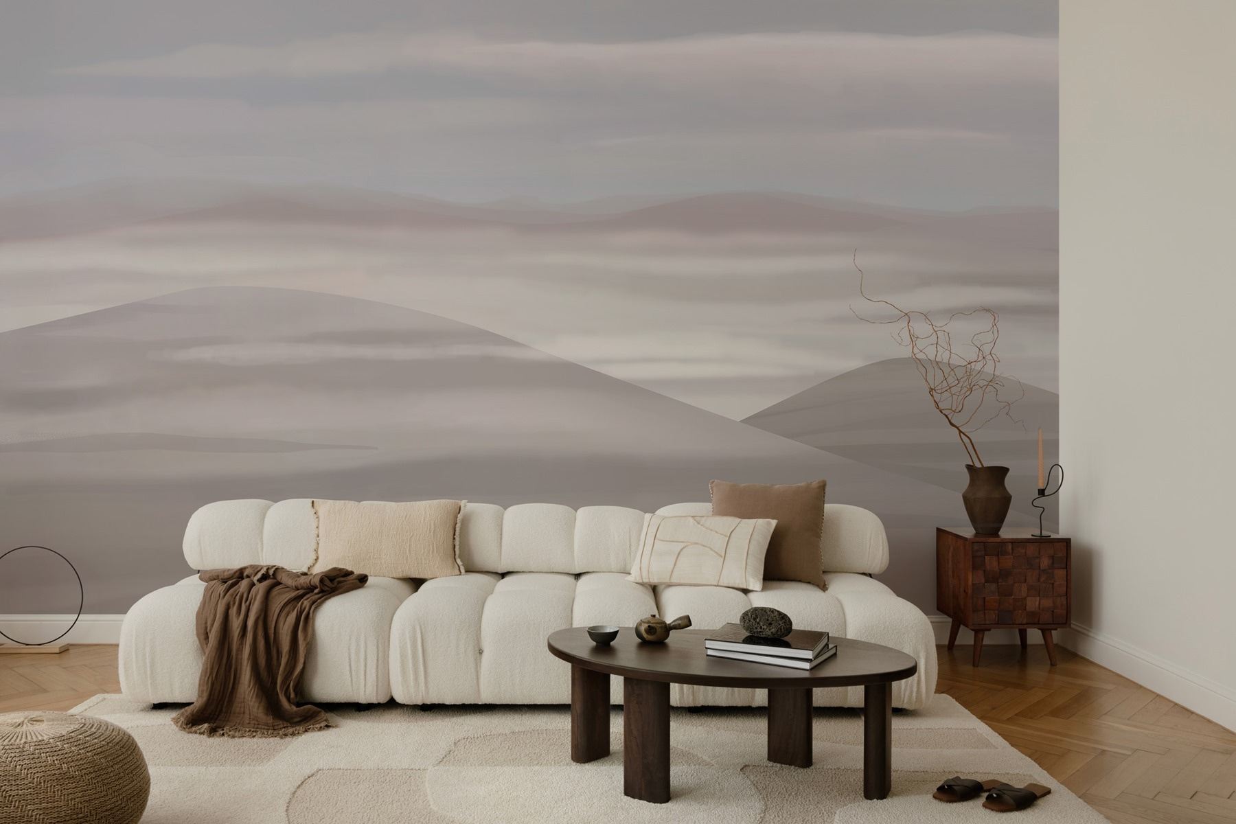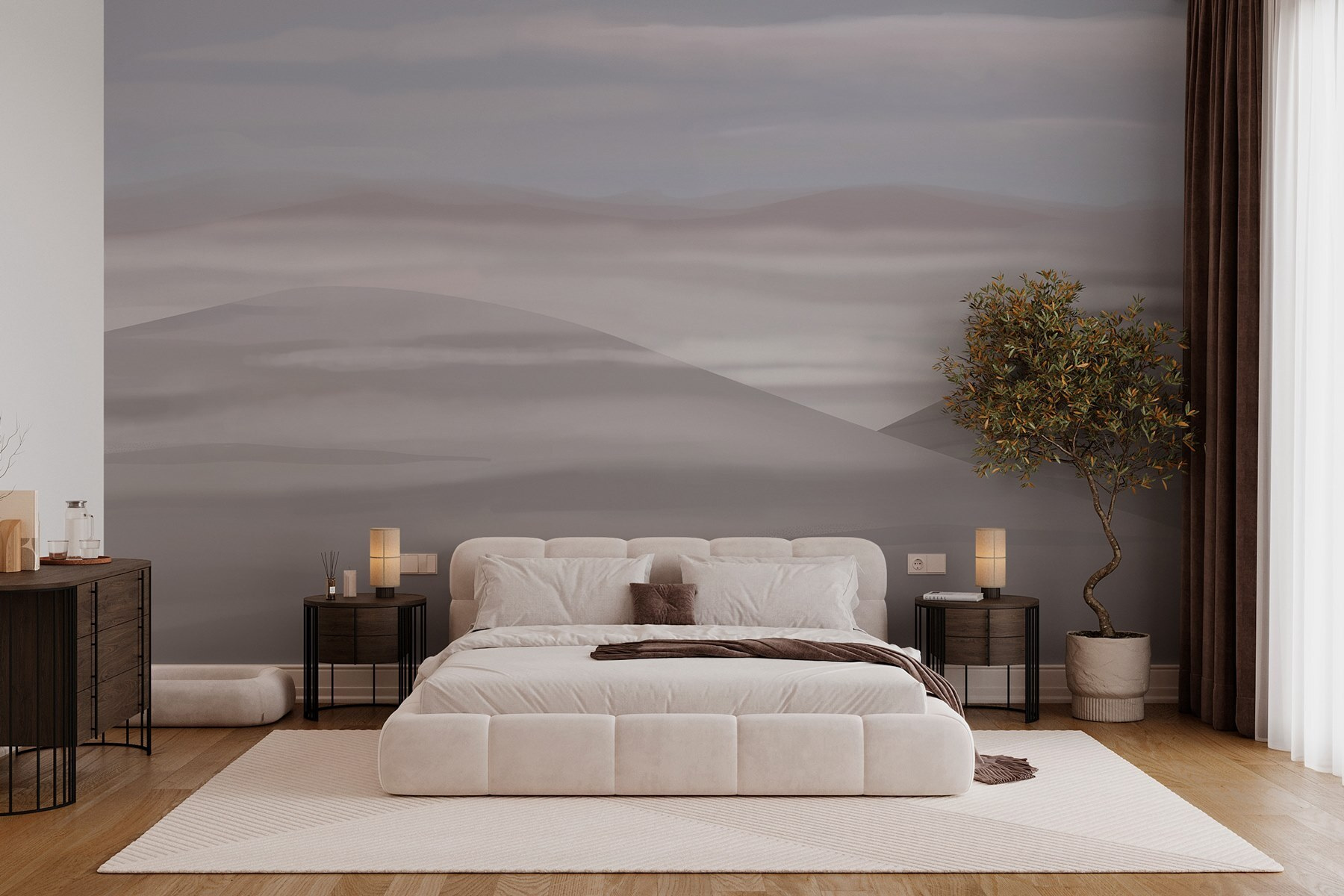 Premeňte každú miestnosť pomocou tejto zasnenej nástennej maľby s jemnými kopcami a mäkkými oblakmi. Predstavte si, že sa ponoríte do pohovky obklopení pokojnou krajinou, ktorá šepká pokoj. Je to ako mini útek bez cestovateľského zhonu! Jemné odtiene vyzývajú k uvoľneniu, takže je ideálny pre útulný čitateľský kútik alebo aj kreatívny pracovný priestor. Priatelia sa sem možno zatúlajú a budú sa cítiť o niečo ľahšie a budú premýšľať, či práve nevstúpili do pokojného obrazu. Táto nástenná maľba nie je len dekoráciou – upokojuje ducha, takže sa pohodlne usaďte a nechajte sa unášať horskými vibráciami!