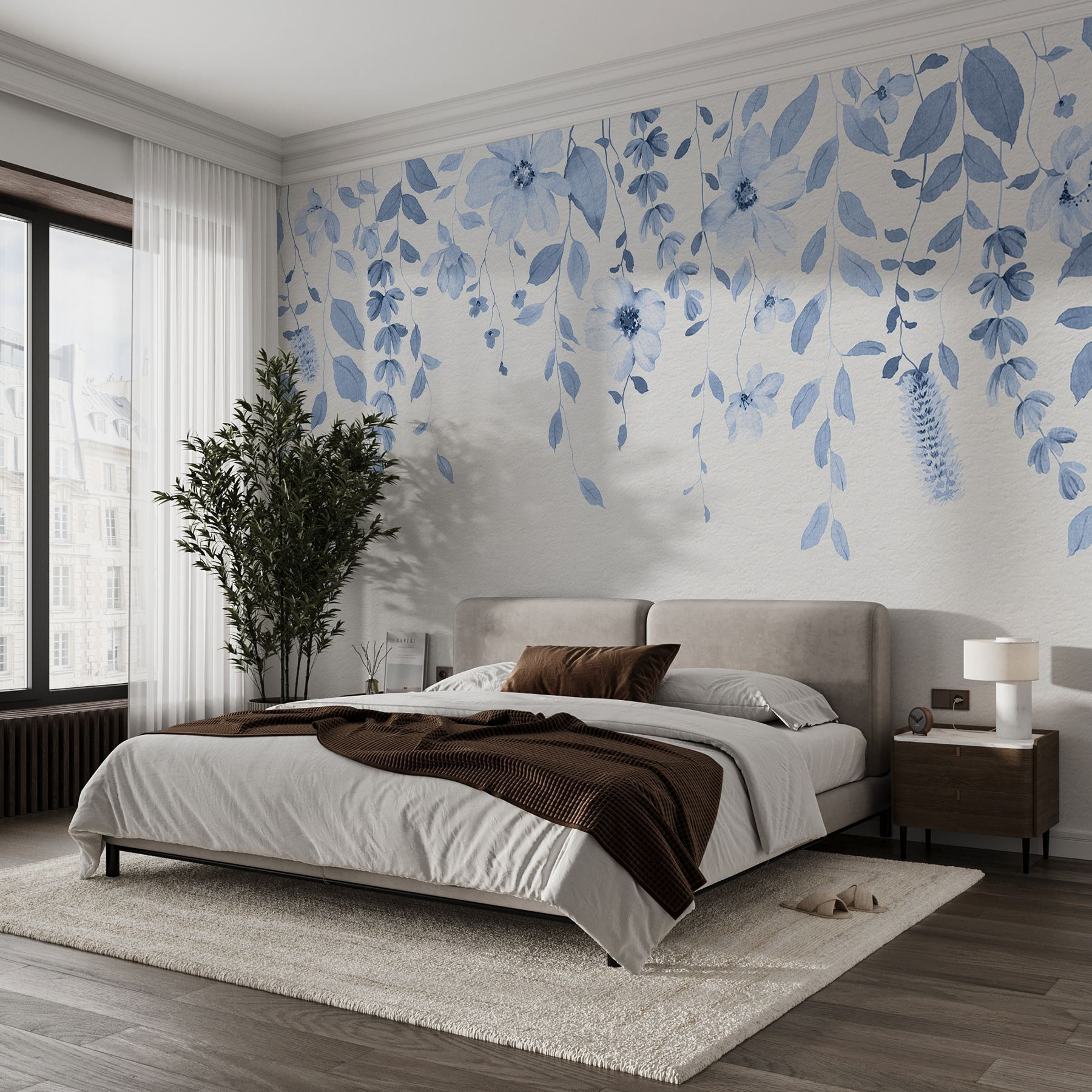 Premeňte akýkoľvek priestor s pokojným šarmom nástennej maľby “Modré kvety a listy”. Predstavte si to: jemná, kaskádovitá prehliadka jemných kvetov a listov, kde odtiene modrej spolu tancujú ako chladný vánok počas slnečného dňa. Je to, akoby ste si priniesli nádych prírody priamo do svojej izby, bez toho, aby ste sa museli starať o zalievanie!
