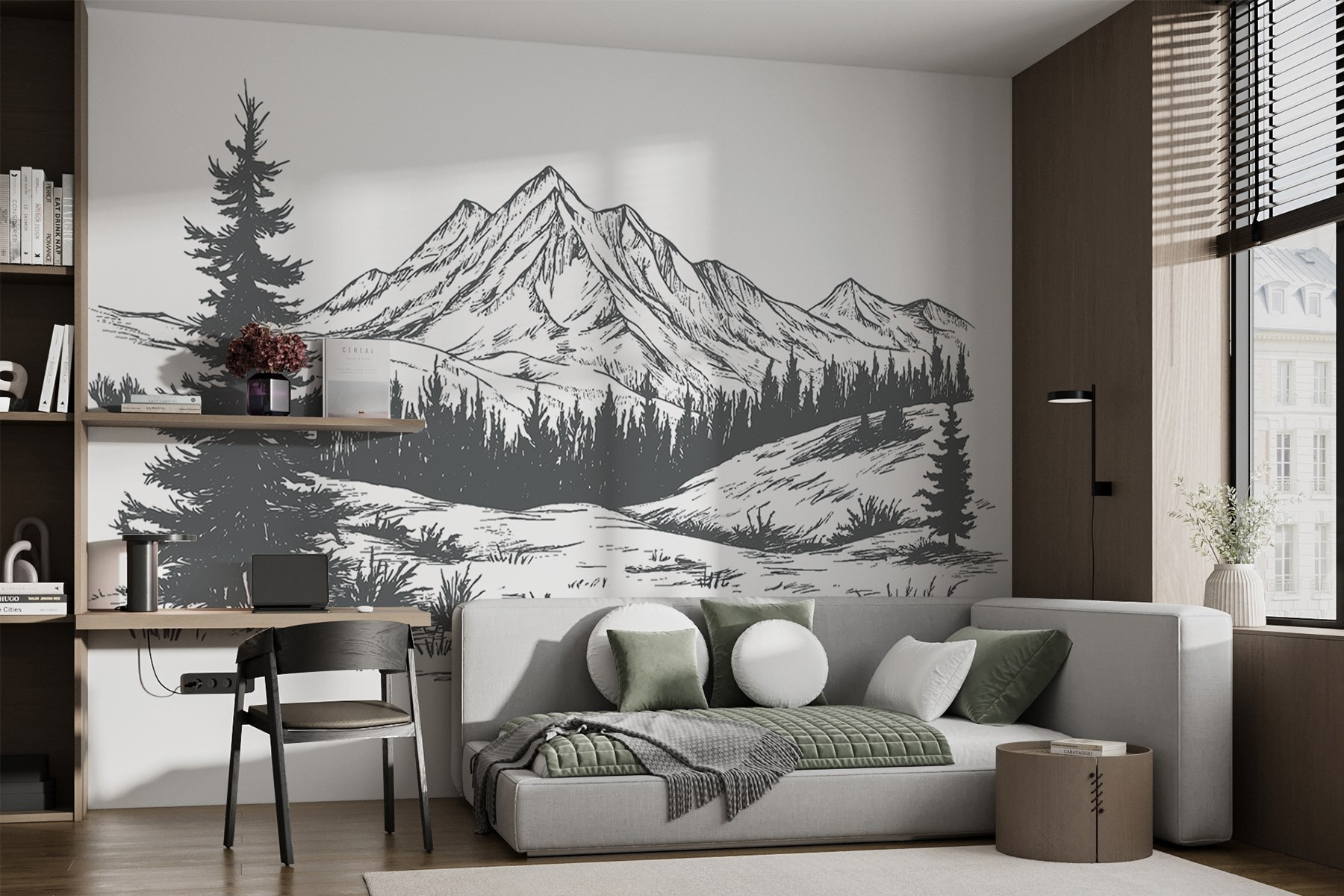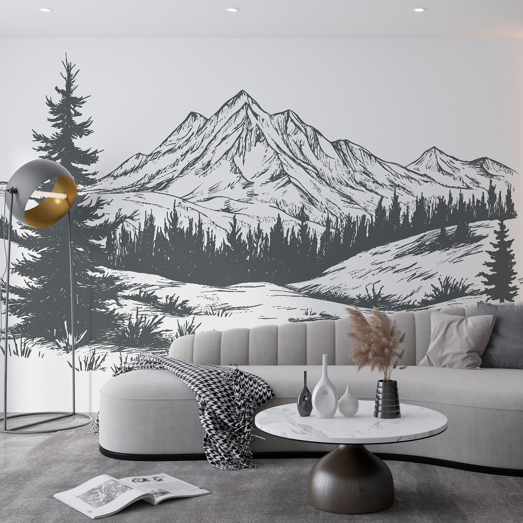 Premeňte svoj priestor na pokojný únik s touto podmanivou nástennou maľbou horského pásma. Predstavte si to: uvelebili ste sa vo svojom obľúbenom kresle, popíjate kávu a pozeráte na majestátne vrcholy a svieže stromy. Je to ako mať útočisko v prírode priamo vo svojej obývačke. Táto nástenná maľba zachytáva krásu veľkej prírody a navodzuje pocit dobrodružstva a pokoja zároveň. Je ideálna pre každého, kto túži po dotyku prírody, a je ideálna na inšpirovanie denných snov alebo živých rozhovorov. Tak prečo nenechať tieto hory inšpirovať vaše ďalšie dobrodružstvo?