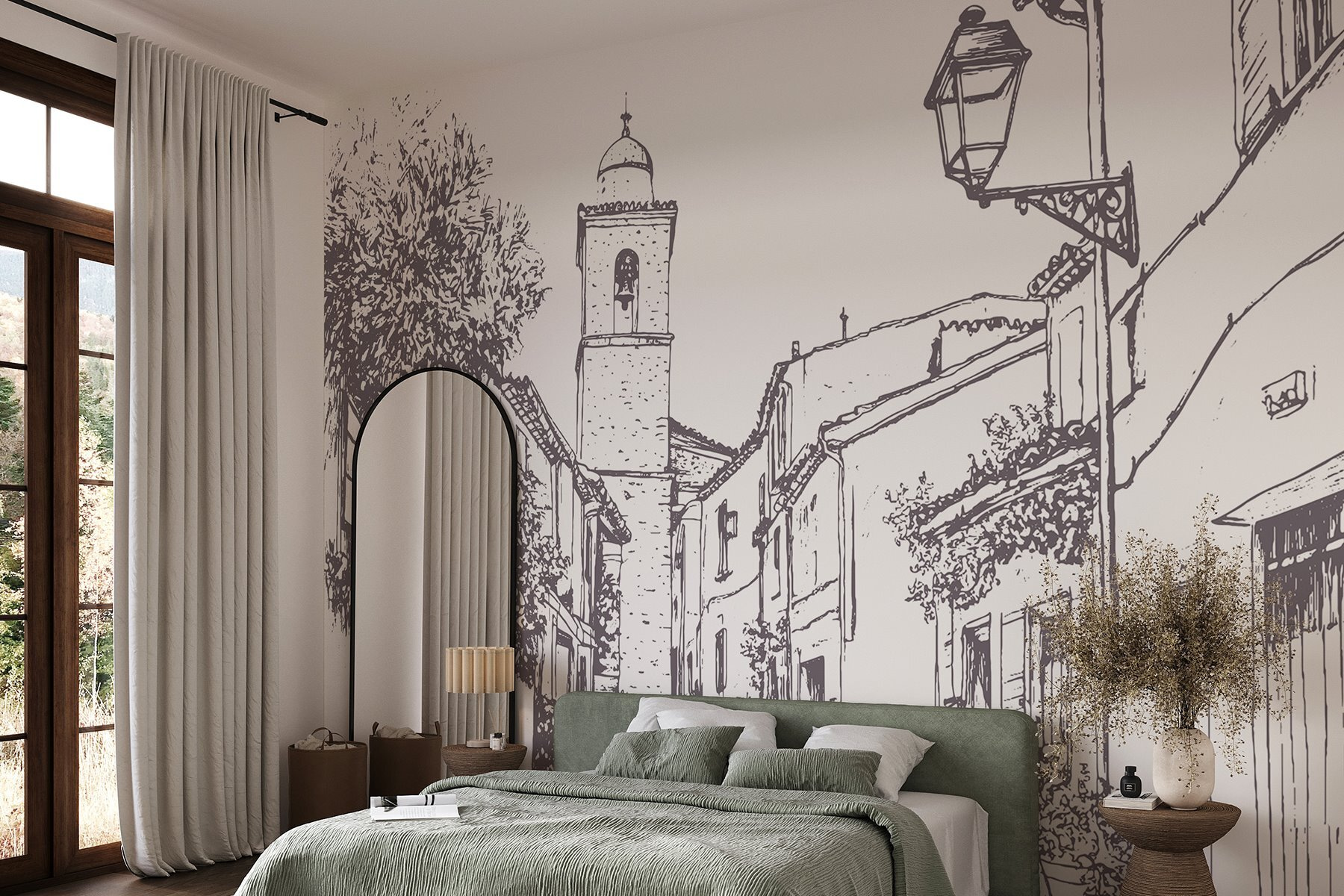 Premeňte akúkoľvek stenu pomocou tejto očarujúcej nástennej maľby s malebnou pouličnou scénou. Predstavte si ju: kľukatá cesta lemovaná fasádami budov a krásnou zvonicou, to všetko zabalené v krásnom skicovom štýle. Je to ako mini únik zakaždým, keď prechádzate okolo. Predstavte si, že si vezmete kávu, usadíte sa do vytvoreného útulného zákutia a necháte svoju myseľ putovať touto malebnou uličkou. Rastliny, ktoré sa plazia po budovách, dodávajú náznak života, pocit tepla a nostalgie. Tento kúsok nie je len dekoráciou, je to výzva na snívanie o slnečných uliciach a dobrodružstvách, ktoré sú hneď za rohom. Ideálny pre tých, ktorí túžia po nádychu rozmarnosti vo svojom priestore!