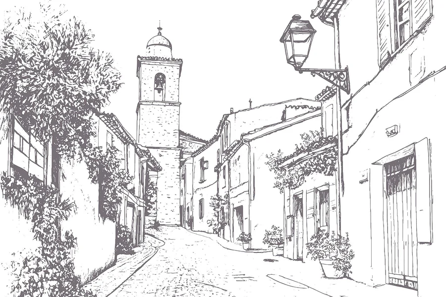 Premeňte akúkoľvek stenu pomocou tejto očarujúcej nástennej maľby s malebnou pouličnou scénou. Predstavte si ju: kľukatá cesta lemovaná fasádami budov a krásnou zvonicou, to všetko zabalené v krásnom skicovom štýle. Je to ako mini únik zakaždým, keď prechádzate okolo. Predstavte si, že si vezmete kávu, usadíte sa do vytvoreného útulného zákutia a necháte svoju myseľ putovať touto malebnou uličkou. Rastliny, ktoré sa plazia po budovách, dodávajú náznak života, pocit tepla a nostalgie. Tento kúsok nie je len dekoráciou, je to výzva na snívanie o slnečných uliciach a dobrodružstvách, ktoré sú hneď za rohom. Ideálny pre tých, ktorí túžia po nádychu rozmarnosti vo svojom priestore!