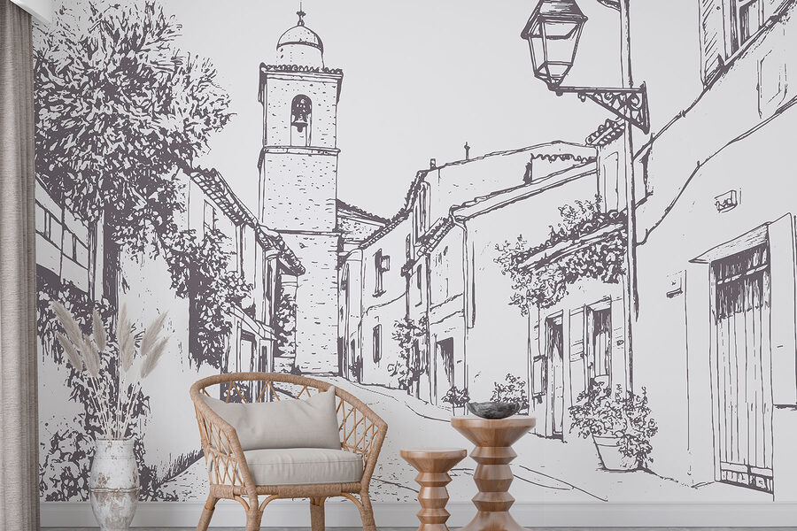 Premeňte akúkoľvek stenu pomocou tejto očarujúcej nástennej maľby s malebnou pouličnou scénou. Predstavte si ju: kľukatá cesta lemovaná fasádami budov a krásnou zvonicou, to všetko zabalené v krásnom skicovom štýle. Je to ako mini únik zakaždým, keď prechádzate okolo. Predstavte si, že si vezmete kávu, usadíte sa do vytvoreného útulného zákutia a necháte svoju myseľ putovať touto malebnou uličkou. Rastliny, ktoré sa plazia po budovách, dodávajú náznak života, pocit tepla a nostalgie. Tento kúsok nie je len dekoráciou, je to výzva na snívanie o slnečných uliciach a dobrodružstvách, ktoré sú hneď za rohom. Ideálny pre tých, ktorí túžia po nádychu rozmarnosti vo svojom priestore!