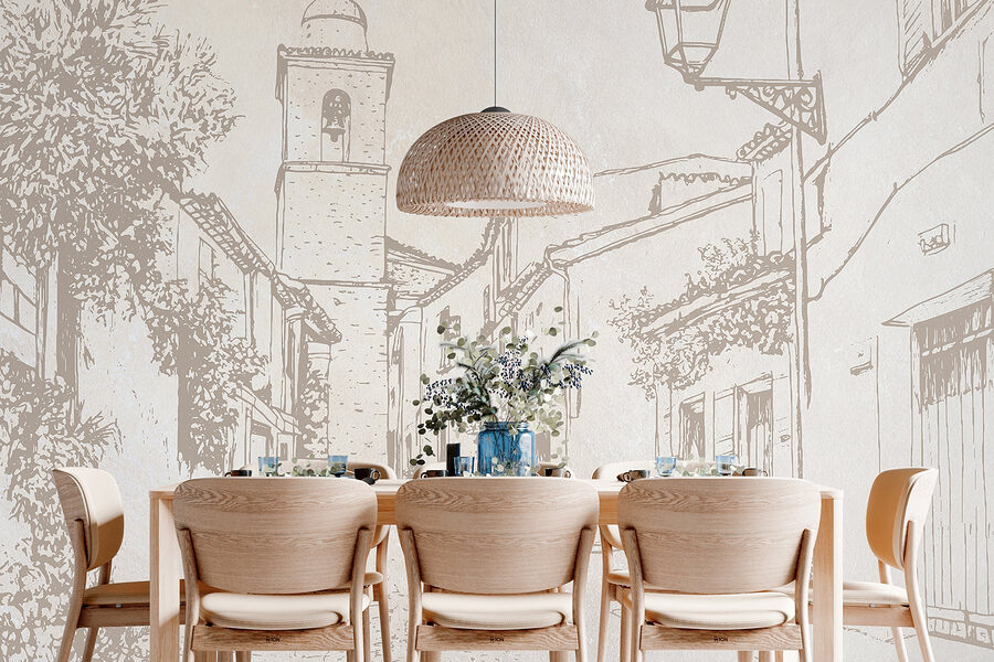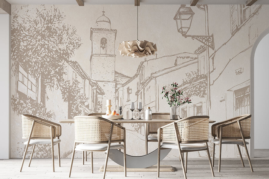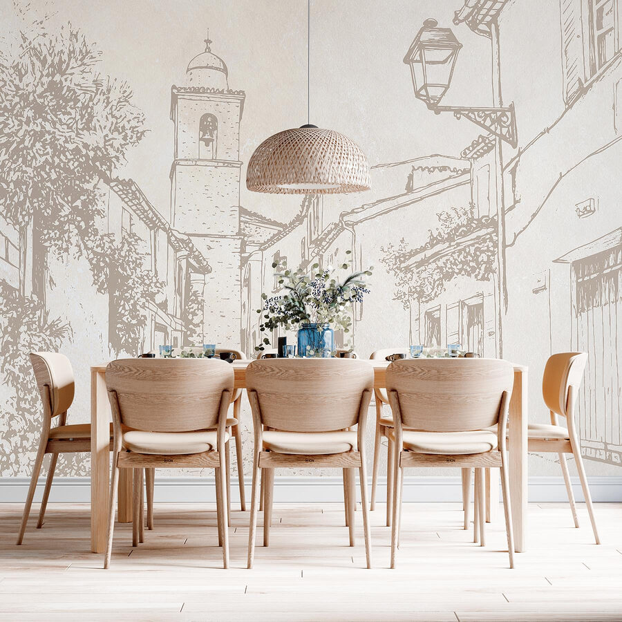 Premeňte akúkoľvek miestnosť na očarujúce útočisko pomocou tejto nástennej maľby, ktorá zobrazuje malebnú uličnú scénu so zvonicou. Len si predstavte, že kráčate po tejto dláždenej ceste a vzduchom sa šíri vôňa čerstvého pečiva. Táto nástenná maľba vás pozýva snívať o slnkom zaliatych popoludniach a priateľských susedoch. Rozmarné línie a jemné odtiene vytvárajú upokojujúcu atmosféru, ktorá je ideálna do obytného priestoru alebo útulného zákutia. Je to ako mať kúsok európskej dediny priamo u vás doma – ideálne na rozprúdenie rozhovorov pri káve plných túlania.