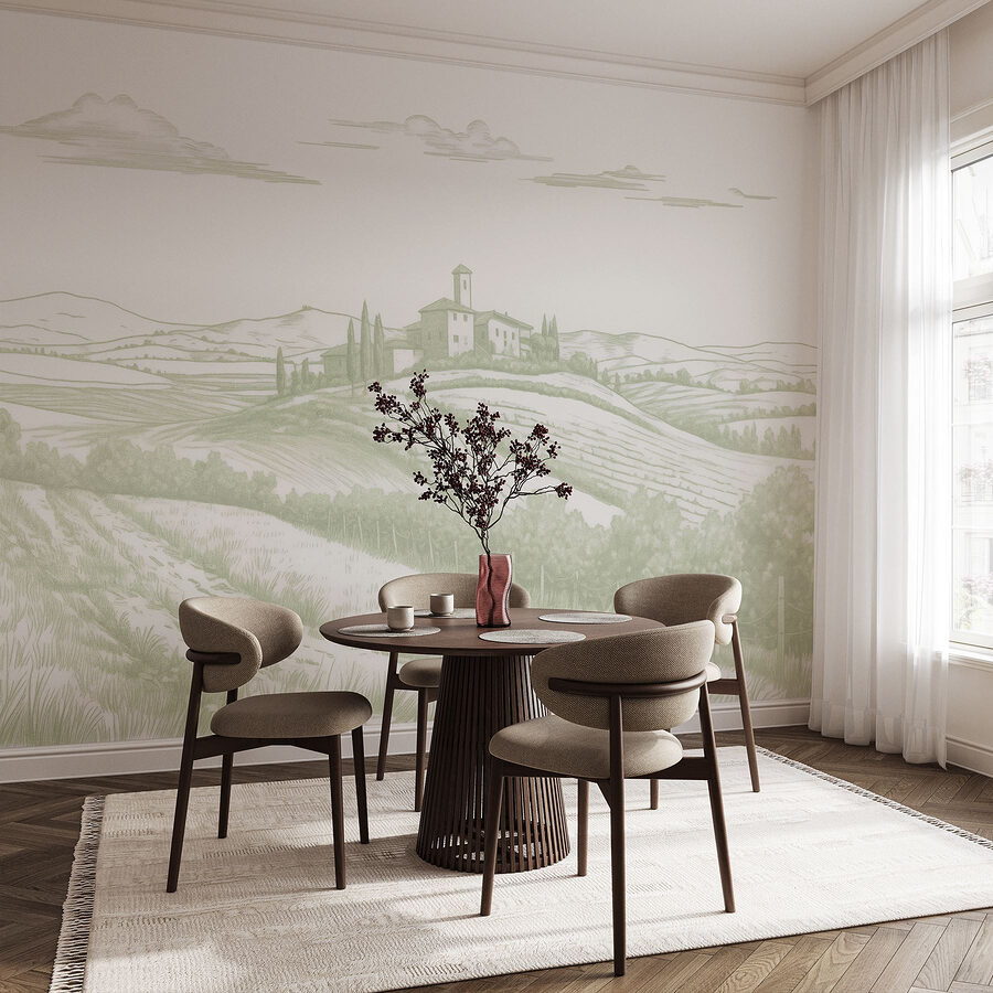 Premeňte akúkoľvek miestnosť na pokojný útek s touto krásnou nástennou maľbou s pokojnou krajinou. Predstavte si tie mierne zvlnené kopce, pôvabný dom objímajúci krajinu a polia tiahnuce sa ďalej ako teplé objatie. Evokuje zasnený víkendový výlet na vidiek – ideálny na to, aby ste sa v každodennej rutine cítili o niečo menej, no, mrzuto. Jemné odtiene prinášajú pokoj, ktorému je ťažké odolať. Je to ako pozvať čerstvý vzduch a pokoj prírody priamo k vám domov, bez alergií a uštipnutí hmyzom. Kto by nechcel mať kúsok raja, na ktorý by sa mohol pozerať pri popíjaní kávy?
