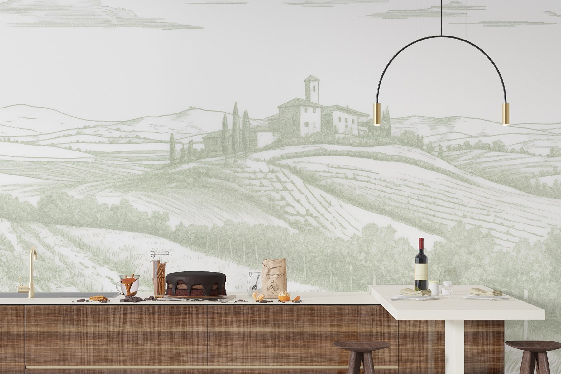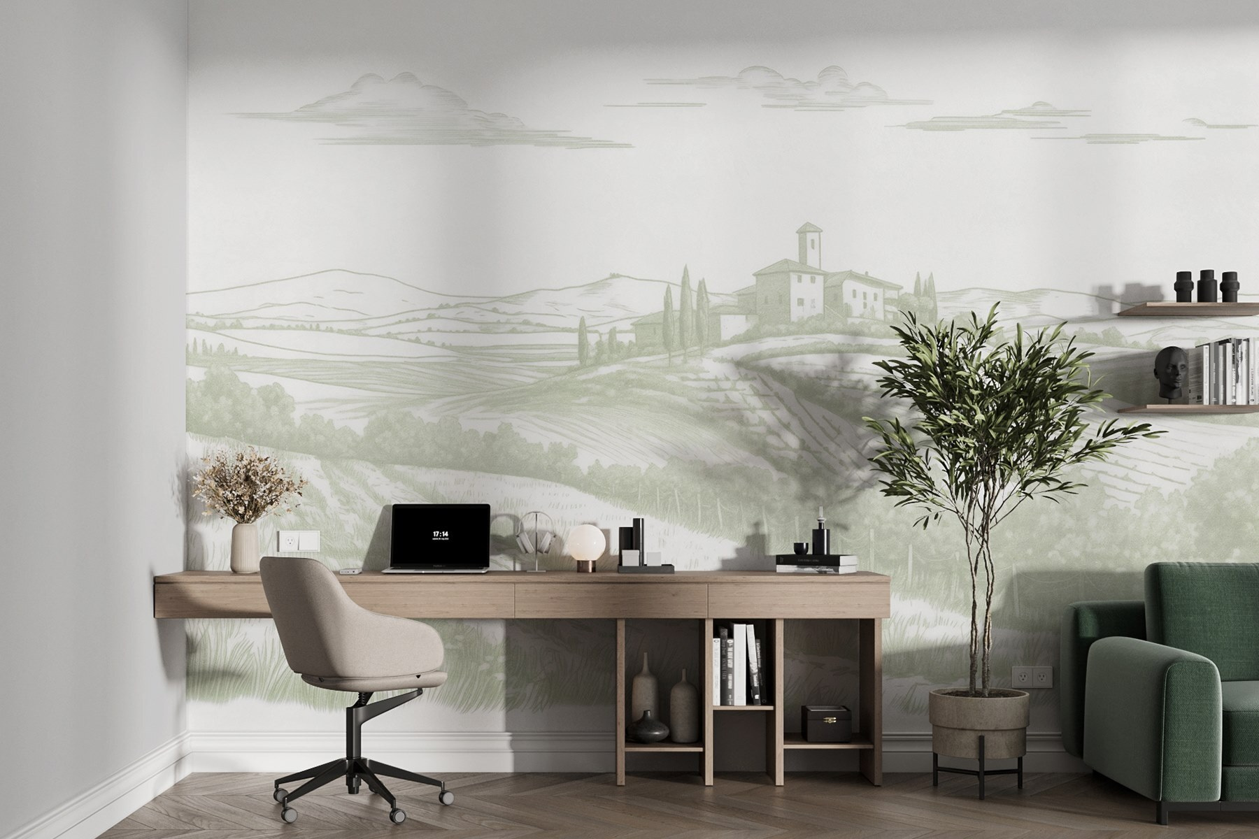 Premeňte akúkoľvek miestnosť na pokojný útek s touto krásnou nástennou maľbou s pokojnou krajinou. Predstavte si tie mierne zvlnené kopce, pôvabný dom objímajúci krajinu a polia tiahnuce sa ďalej ako teplé objatie. Evokuje zasnený víkendový výlet na vidiek – ideálny na to, aby ste sa v každodennej rutine cítili o niečo menej, no, mrzuto. Jemné odtiene prinášajú pokoj, ktorému je ťažké odolať. Je to ako pozvať čerstvý vzduch a pokoj prírody priamo k vám domov, bez alergií a uštipnutí hmyzom. Kto by nechcel mať kúsok raja, na ktorý by sa mohol pozerať pri popíjaní kávy?