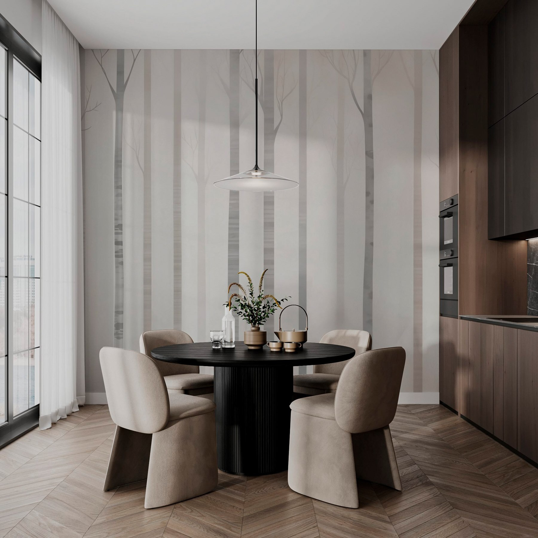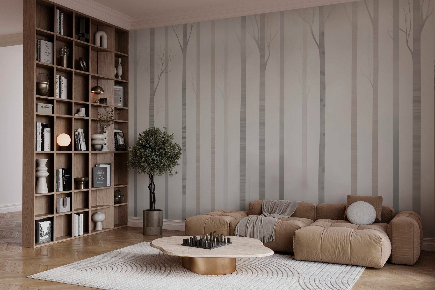 Vstúpte do zasneného sveta s touto nástennou maľbou s pokojnou skupinou stromov zahalených v jemnej hmle. Je to ako mať kúsok prírody priamo vo svojom obytnom priestore bez rizika, že šliapnete do blata. Predstavte si to: uvelebte sa s dobrou knihou, zatiaľ čo jemné, prízračné kmene vytvárajú pokojnú kulisu. Dodáva miestnostiam vzdušný nádych, vďaka ktorému pôsobia priestranne a svetlo. Ideálne pre tých, ktorí túžia po spojení s vonkajším prostredím, ale zároveň si užívajú pohodlie domova. Táto nástenná maľba šepká pokoj a nabáda k tvorivosti – hovoríme o začatí rozhovoru! Kto by sa nechcel pozerať na pokojný les počas snívania?