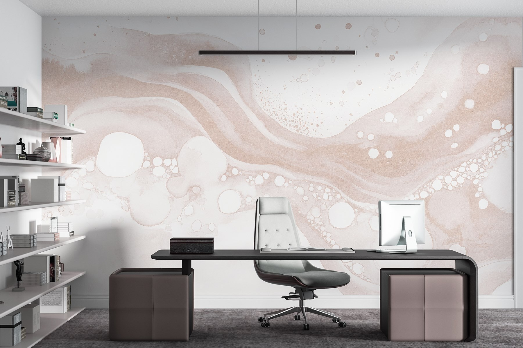 Premeňte nudný priestor na pokojné útočisko s touto úžasnou nástennou maľbou “Biela a hnedá tekutina s bielymi kruhmi a bodkami”. Predstavte si, že sa zobudíte na jemné, víriace odtiene, ktoré tancujú po stene a vytvárajú jemnú atmosféru, ktorá vyzýva k relaxácii. Jedinečné bodky a tekuté tvary imitujú spleť kreativity – ideálne do útulnej obývačky alebo zasnenej spálne.