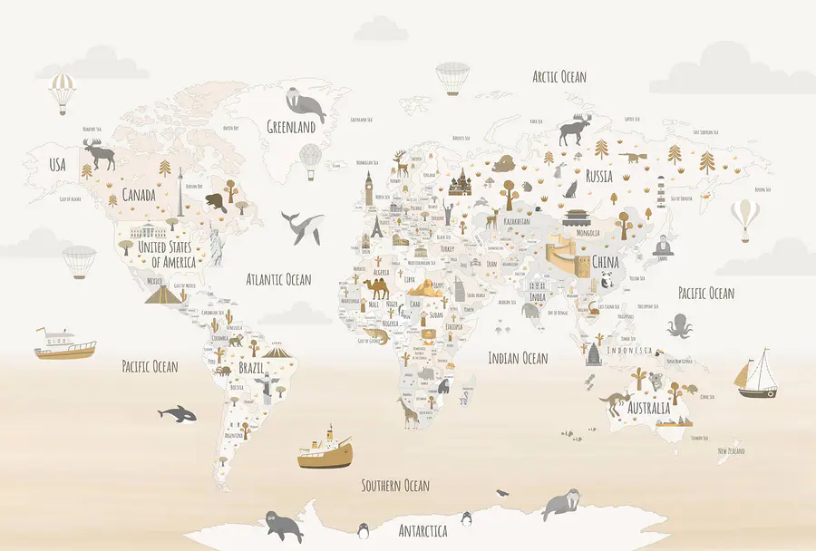 S nástennou maľbou Mapa sveta premeníte každý priestor na malú dobrodružnú zónu. Len si to predstavte – deti sedia so skríženými nohami, oči sa im lesknú a prstami sledujú kontinenty a oceány. Táto nástenná maľba nie je len umením, ale aj výzvou na objavovanie a učenie. Vďaka hravým ilustráciám zvierat a ikonických pamiatok vzbudzuje zvedavosť a podnecuje predstavivosť. Či už ide o detskú izbu alebo študijný kútik, dodáva mu nádych rozmarnosti, vďaka ktorému sa každý pohľad naň bude zdať ako mini únik. Kto vie? Možno inšpiruje niektorých budúcich svetobežníkov! Rozžiarte tieto steny a nechajte sa unášať túlavými zážitkami!