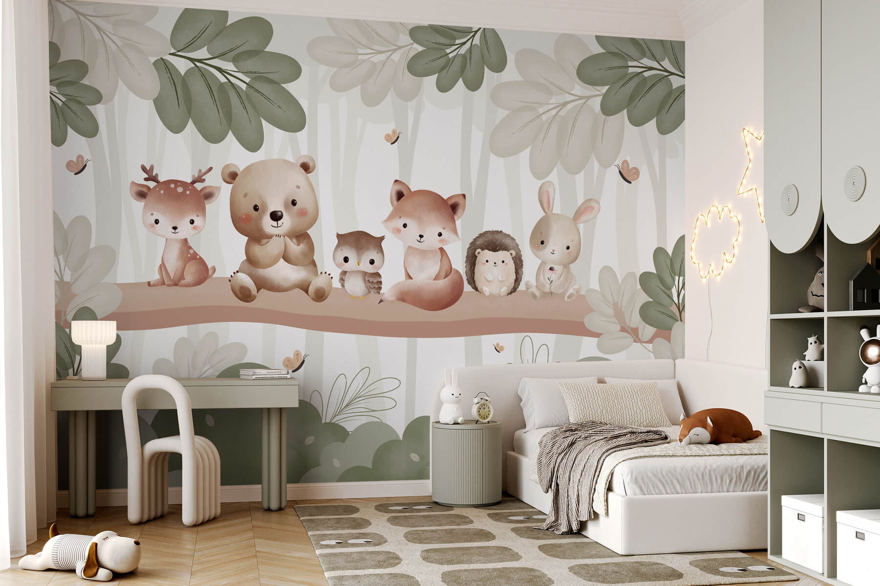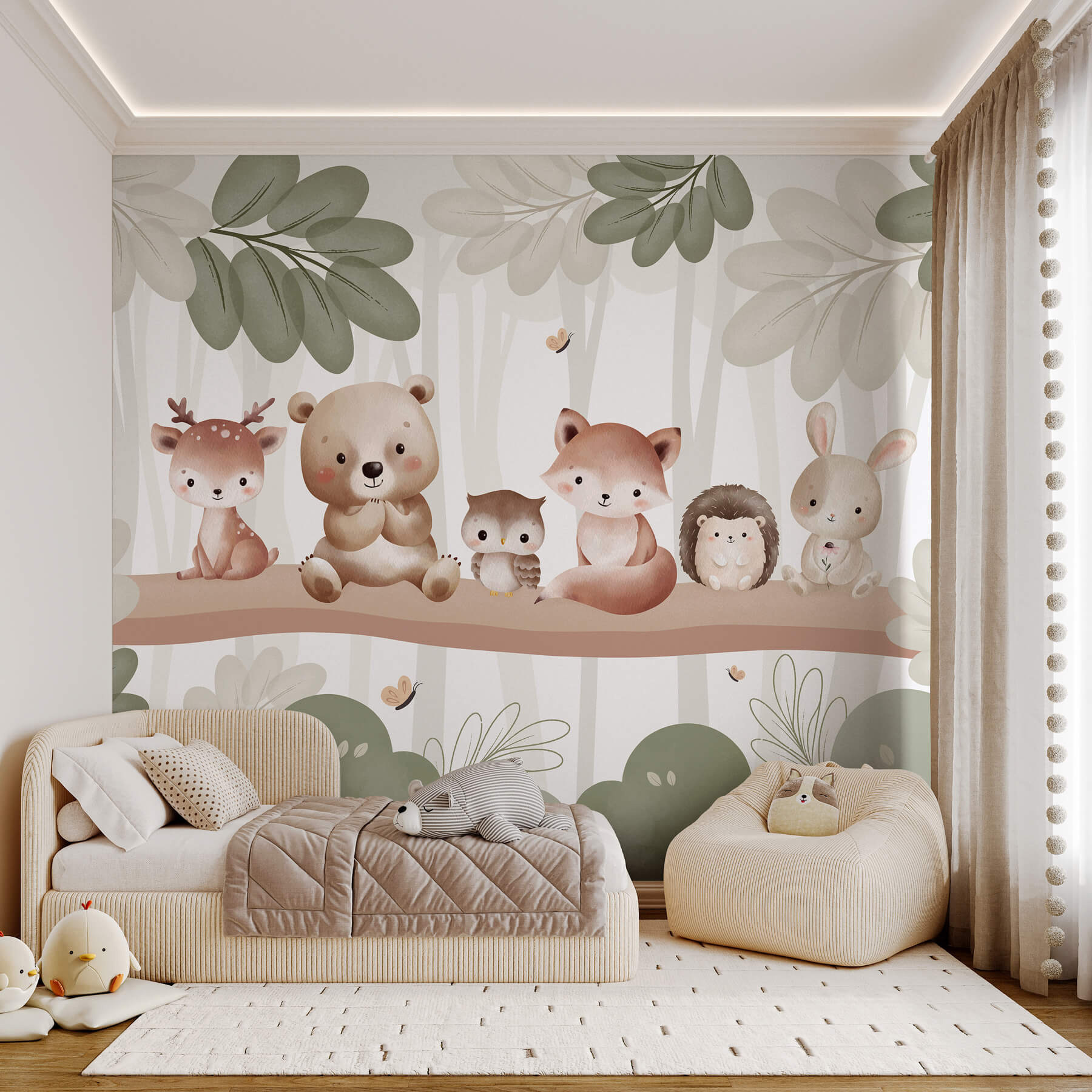 Predstavte si útulné zákutie plné čara lesnej krajiny. Táto rozkošná nástenná maľba obsahuje rozkošnú posádku zvieracích kamarátov, ktorí sedia na konári a sú pripravení vniesť do každého priestoru nádych rozmarnosti. Predstavte si plachého jeleňa, zvedavého medveďa a hravú líšku, ktorí sa usadili medzi zelenými listami. Je to dokonalé pozadie pre detskú izbu, ktoré podnecuje príbehy o dobrodružstvách v čarovnom lese. Každý pohľad nabáda k chichotaniu a predstavivosti a vytvára teplo, ktoré vás obklopí ako obľúbená deka. Premeňte obyčajné veci na niečo naozaj výnimočné s týmito roztomilými lesnými kamarátmi!
