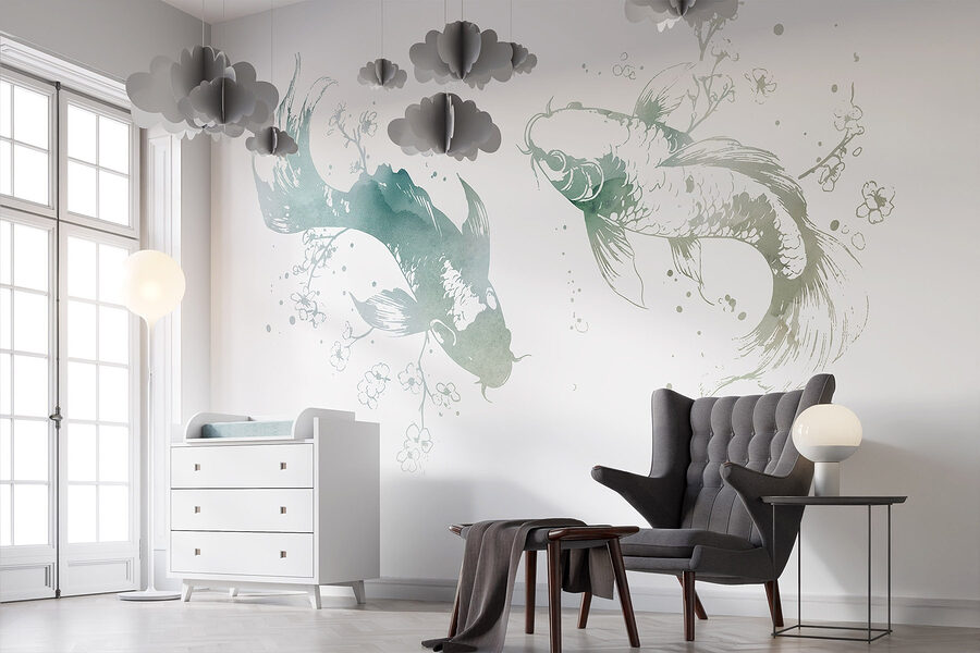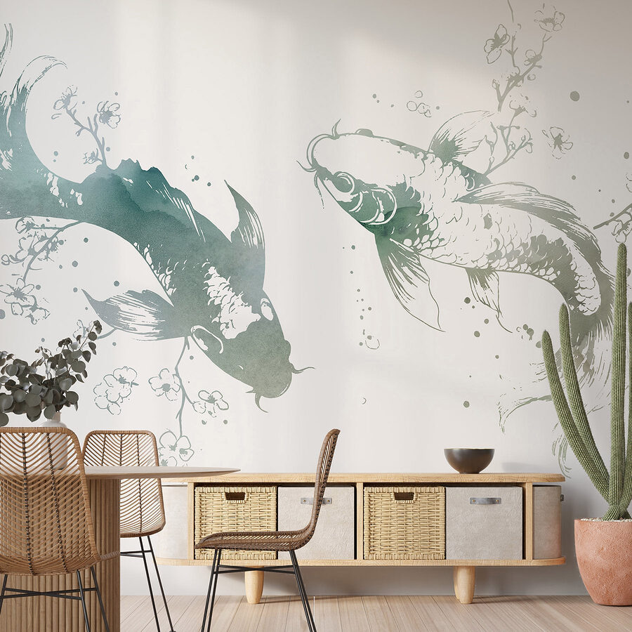 Premeňte svoj priestor na pokojné útočisko s touto podmanivou nástennou maľbou s dvoma pôvabnými rybami obklopenými jemnými kvetmi a listami. Predstavte si, že vojdete do miestnosti a ony sa tam kĺžu po jemných akvareloch, ktoré vašim stenám vdýchnu život. Je to ako mať doma malý kúsok prírody, ktorý pri každom pohľade navodzuje pocit pokoja.