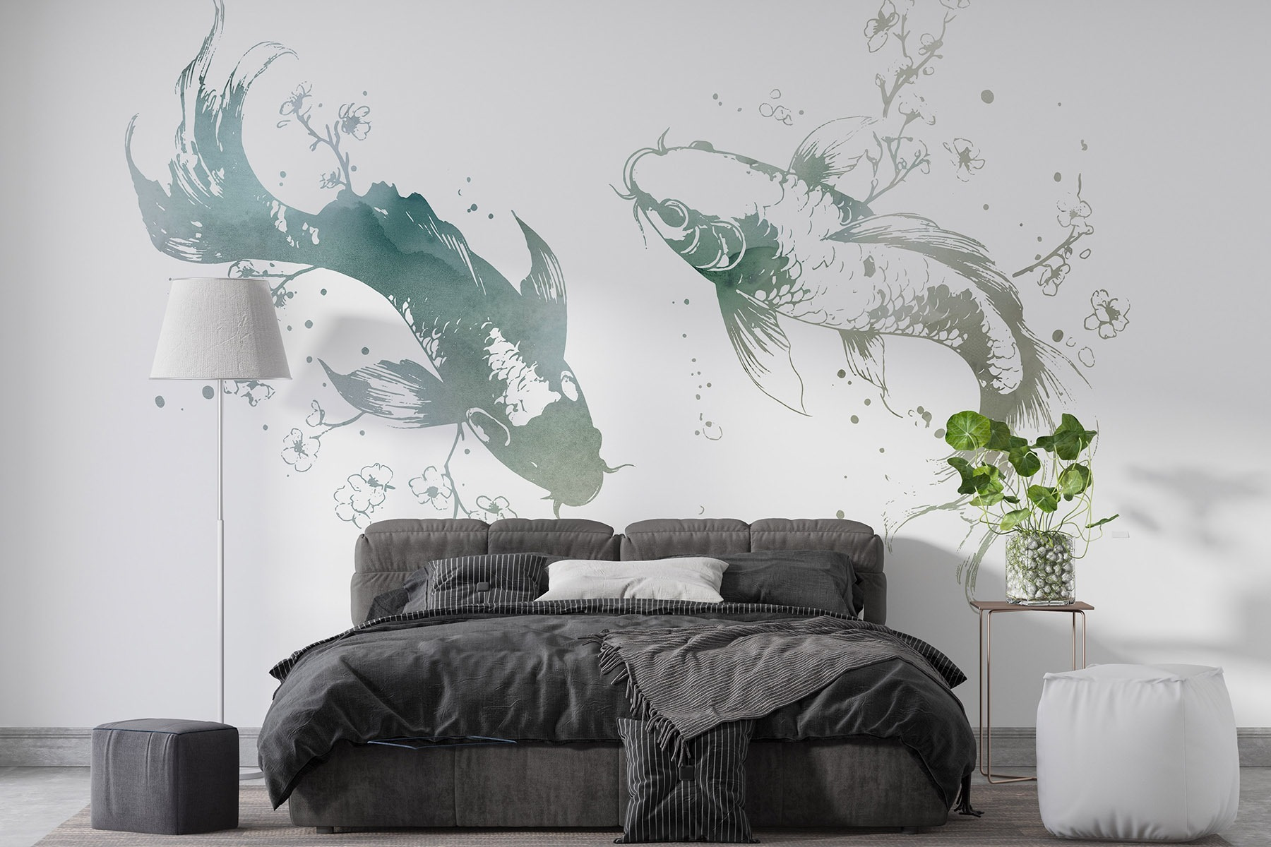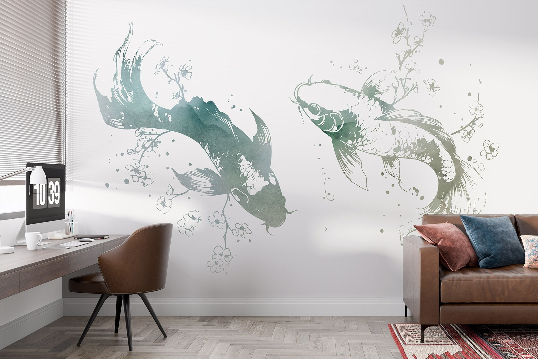 Premeňte svoj priestor na pokojné útočisko s touto podmanivou nástennou maľbou s dvoma pôvabnými rybami obklopenými jemnými kvetmi a listami. Predstavte si, že vojdete do miestnosti a ony sa tam kĺžu po jemných akvareloch, ktoré vašim stenám vdýchnu život. Je to ako mať doma malý kúsok prírody, ktorý pri každom pohľade navodzuje pocit pokoja.