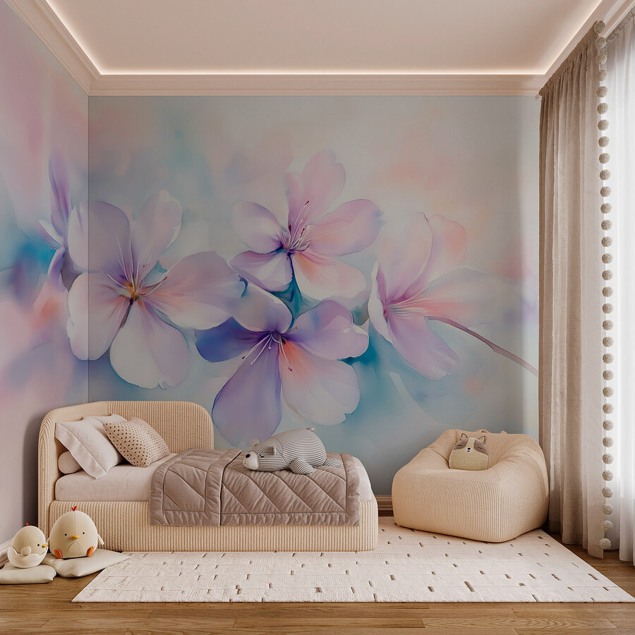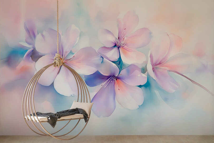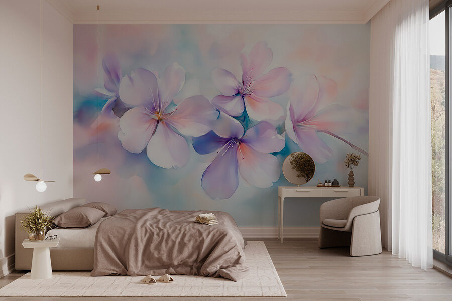 Predstavte si, že priamo z obývačky vstúpite do vysnívanej japonskej záhrady. Táto nástenná maľba s krásnym zhlukom fialových kvetov prináša pocit pokoja a krásy, ktorý je pre váš domov ako jemné objatie. Vďaka jemnému akvarelovému štýlu sa zdá, že každý okvetný lístok sa jemne chveje, čím dodáva každému priestoru nádych rozmarnosti. Predstavte si, ako sa krútite s dobrou knihou obklopení týmito kvetmi a okamžite premeníte obyčajný deň na pokojné útočisko. Je to ako preniesť kúsok prírody do interiéru – bez včiel! Ideálny spôsob, ako oživiť spálňu alebo dodať šarm útulnému čitateľskému kútiku.