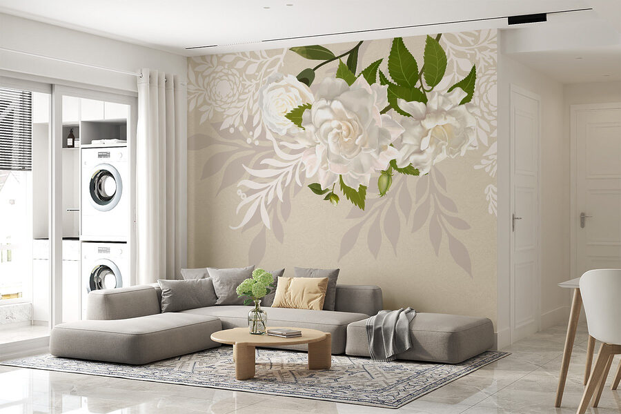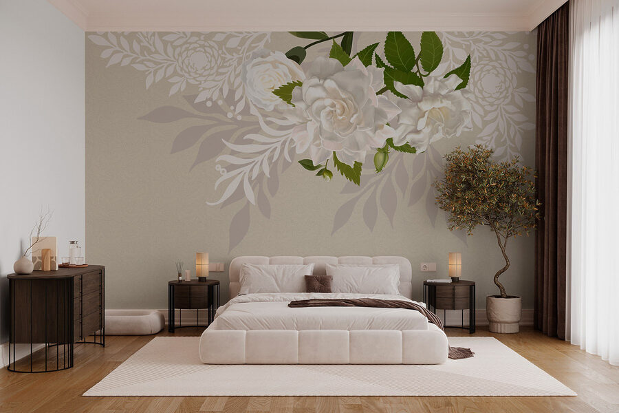 Premeňte svoj priestor s nádherným nádychom prírody prostredníctvom tejto “Nástennej maľby Biele kvety so zelenými listami”. Predstavte si, že vstúpite do miestnosti, kde vás nežné biele kvety a svieže zelené listy vítajú ako starý priateľ. Jemné farby tancujú na stene a ponúkajú pokojné útočisko pred denným zhonom. Či už zdobí útulnú obývaciu izbu alebo pokojnú spálňu, táto fototapeta dodáva nádych elegancie a tepla. Je to ako preniesť tajnú záhradu do interiéru. Navyše je to skvelý podnet na rozhovor – kto by sa nechcel rozprávať o kvetoch? Prijmite do svojho domova kúsok prírody!